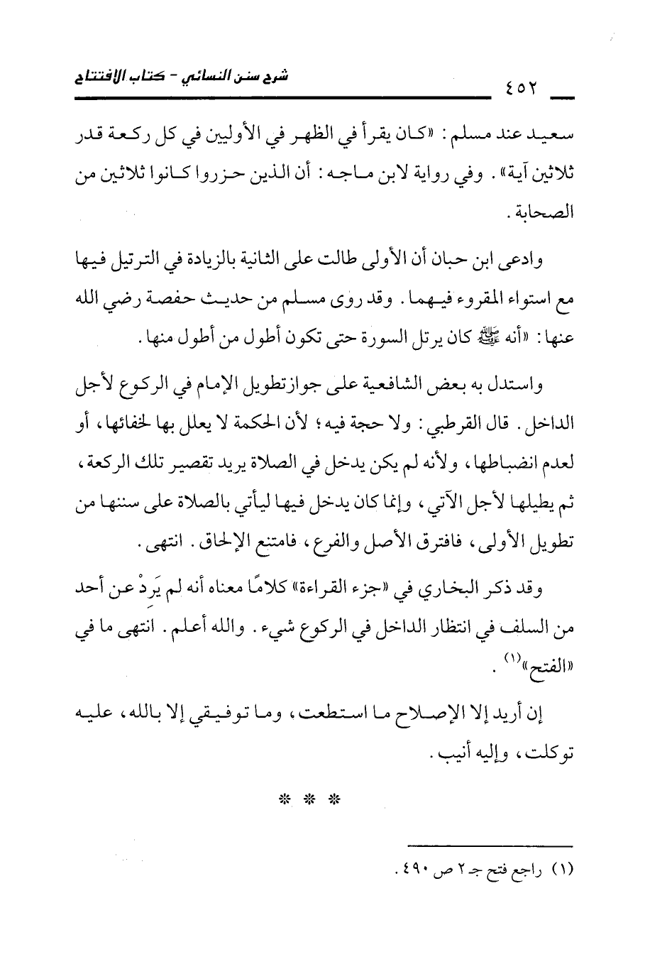 وقد ذكر البخاري في "جزء القراءة" كلامًا معناه أنه لم يَرِدْ عن أحد من السلف في انتظار الداخل في الركوع شيء. والله أعلم. انتهى ما في "الفتح" (¬1).