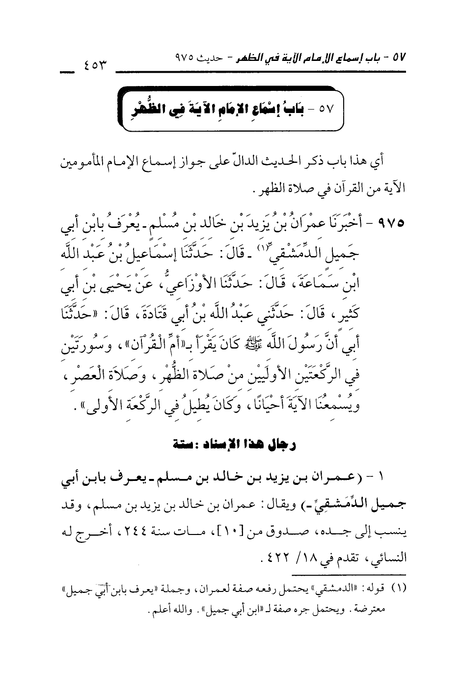 975 - أَخْبَرَنَا عِمْرَانُ بْنُ يَزِيدَ بْنِ خَالِدِ بْنِ مُسْلِمٍ -يُعْرَفُ بِابْنِ أَبِي جَمِيلٍ الدِّمَشْقِيِّ (¬1) - قَالَ: حَدَّثَنَا إِسْمَاعِيلُ بْنُ عَبْدِ اللَّهِ بْنِ سَمَاعَةَ، قَالَ: حَدَّثَنَا الأَوْزَاعِيُّ، عَنْ يَحْيَى بْنِ أَبِي كَثِيرٍ، قَالَ: حَدَّثَنِي عَبْدُ اللَّهِ بْنُ أَبِي قَتَادَةَ، قَالَ: "حَدَّثَنَا أَبِي أَنَّ رَسُولَ اللَّهِ - صلى الله عليه وسلم - كَانَ يَقْرَأُ بِـ"أُمِّ الْقُرْآنِ"، وَسُورَتَيْنِ فِي الرَّكْعَتَيْنِ الأُولَيَيْنِ مِنْ صَلاَةِ الظُّهْرِ، وَصَلاَةِ الْعَصْرِ، وَيُسْمِعُنَا الآيَةَ أَحْيَانًا، وَكَانَ يُطِيلُ فِي الرَّكْعَةِ الأُولَى".
