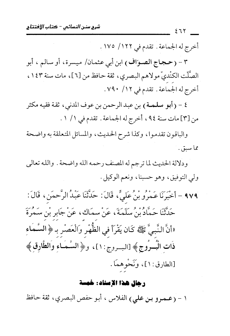 987 - أَخْبَرَنَا عَمْرُو بْنُ عَلِيٍّ، قَالَ: حَدَّثَنَا عَبْدُ الرَّحْمَنِ، قَالَ: حَدَّثَنَا حَمَّادُ بْنُ سَلَمَةَ، عَنْ سِمَاكٍ، عَنْ جَابِرِ بْنِ سَمُرَةَ "أَنَّ النَّبِيَّ - صلى الله عليه وسلم - كَانَ يَقْرَأُ فِي الظُّهْرِ وَالْعَصْرِ بِـ" {السَّمَاءِ ذَاتِ الْبُرُوجِ} [البروج: 1]، و {السَّمَاءِ وَالطَّارِقِ} [الطارق: 1]، وَنَحْوِهِمَا.