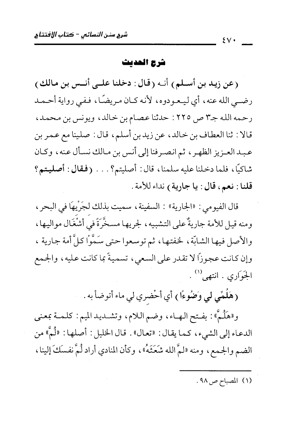 (عن زيد بن أسلم) أنه (قال: دخلنا على أنس بن مالك) رضي الله عنه، أي ليعودوه, لأنه كان مريضًا، ففي رواية أحمد رحمه الله جـ 3 ص 225: حدثنا عصام بن خالد، ويونس بن محمد، قالا: ثنا العطاف بن خالد، عن زيد بن أسلم، قال: صلينا مع عمر بن عبد العزيز الظهر، ثم انصرفنا إلى أنس بن مالك نسأل عنه، وكان شاكيًا، فلما دخلنا عليه سلمنا، قال: أصليتم؟ ... (فقال: أصليتم؟ قلنا: نعم، قال: يا جارية) نداء للأمة.