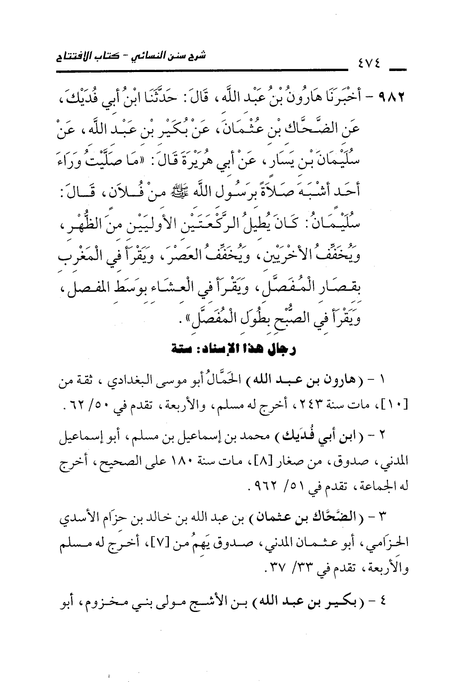 982 - أَخْبَرَنَا هَارُونُ بْنُ عَبْدِ اللَّهِ، قَالَ: حَدَّثَنَا ابْنُ أَبِي فُدَيْكٍ، عَنِ الضَّحَّاكِ بْنِ عُثْمَانَ، عَنْ بُكَيْرِ بْنِ عَبْدِ اللَّهِ، عَنْ سُلَيْمَانَ بْنِ يَسَارٍ، عَنْ أَبِي هُرَيْرَةَ قَالَ: "مَا صَلَّيْتُ وَرَاءَ أَحَدٍ أَشْبَهَ صَلاَةً بِرَسُولِ اللَّهِ - صلى الله عليه وسلم - مِنْ فُلاَنٍ، قَالَ: سُلَيْمَانُ: كَانَ يُطِيلُ الرَّكْعَتَيْنِ الأُولَيَيْنِ مِنَ الظُّهْرِ، وَيُخَفِّفُ الأُخْرَيَيْنِ، وَيُخَفِّفُ الْعَصْرَ، وَيَقْرَأُ فِي الْمَغْرِبِ بِقِصَارِ الْمُفَصَّلِ، وَيَقْرَأُ فِي الْعِشَاءِ بِوَسَطِ الْمُفَصَّلِ، وَيَقْرَأُ فِي الصُّبْحِ بِطُوَلِ الْمُفَصَّلِ".