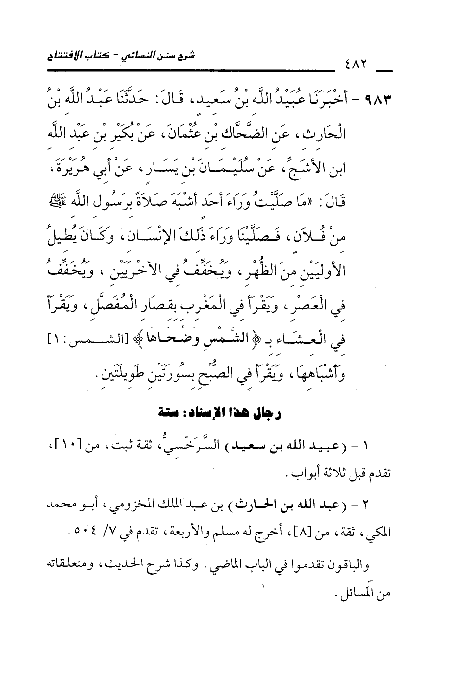 983 - أَخْبَرَنَا عُبَيْدُ اللَّهِ بْنُ سَعِيدٍ، قَالَ: حَدَّثَنَا عَبْدُ اللَّهِ بْنُ الْحَارِثِ، عَنِ الضَّحَّاكِ بْنِ عُثْمَانَ، عَنْ بُكَيْرِ بْنِ عَبْدِ اللَّهِ بْنِ الأَشَجِّ، عَنْ سُلَيْمَانَ بْنِ يَسَارٍ، عَنْ أَبِي هُرَيْرَةَ، قَالَ: "مَا صَلَّيْتُ وَرَاءَ أَحَدٍ أَشْبَهَ صَلاَةً بِرَسُولِ اللَّهِ - صلى الله عليه وسلم - مِنْ فُلاَنٍ، فَصَلَّيْنَا وَرَاءَ ذَلِكَ الإِنْسَانِ، وَكَانَ يُطِيلُ الأُولَيَيْنِ مِنَ الظُّهْرِ، وَيُخَفِّفُ فِي الأُخْرَيَيْنِ، وَيُخَفِّفُ فِي الْعَصْرِ، وَيَقْرَأُ فِي الْمَغْرِبِ بِقِصَارِ الْمُفَصَّلِ، وَيَقْرَأُ فِي الْعِشَاءِ بِـ {وَالشَّمْسِ وَضُحَاهَا (1)} [الشمس: 1] وَأَشْبَاهِهَا، وَيَقْرَأُ فِي الصُّبْحِ بِسُورَتَيْنِ طَوِيلَتَيْنِ.