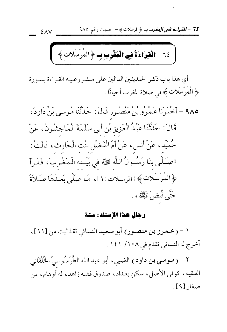 985 - أَخْبَرَنَا عَمْرُو بْنُ مَنْصُورٍ، قَالَ: حَدَّثَنَا مُوسَى بْنُ دَاوُدَ، قَالَ: حَدَّثَنَا عَبْدُ الْعَزِيزِ بْنُ أَبِي سَلَمَةَ الْمَاجِشُونُ، عَنْ حُمَيْدٍ، عَنْ أَنَسٍ، عَنْ أُمِّ الْفَضْلِ بِنْتِ الْحَارِثِ، قَالَتْ: "صَلَّى بِنَا رَسُولُ اللَّهِ - صلى الله عليه وسلم - فِي بَيْتِهِ الْمَغْرِبَ، فَقَرَأَ {الْمُرْسَلَاتِ} [المرسلات: 1]، مَا صَلَّى بَعْدَهَا صَلاَةً حَتَّى قُبِضَ - صلى الله عليه وسلم -".