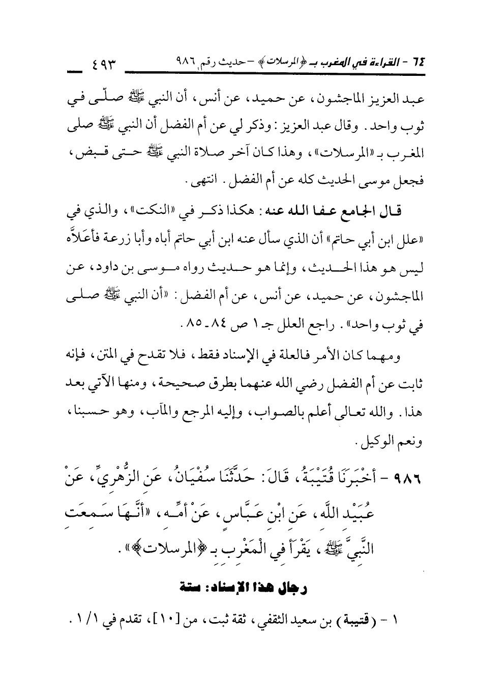 986 - أَخْبَرَنَا قُتَيْبَةُ، قَالَ: حَدَّثَنَا سُفْيَانُ، عَنِ الزُّهْرِيِّ، عَنْ عُبَيْدِ اللَّهِ، عَنِ ابْنِ عَبَّاسٍ، عَنْ أُمِّهِ، "أَنَّهَا سَمِعَتِ النَّبِيَّ - صلى الله عليه وسلم - يَقْرَأُ فِي الْمَغْرِبِ بِـ {الْمُرْسَلَاتِ} ".