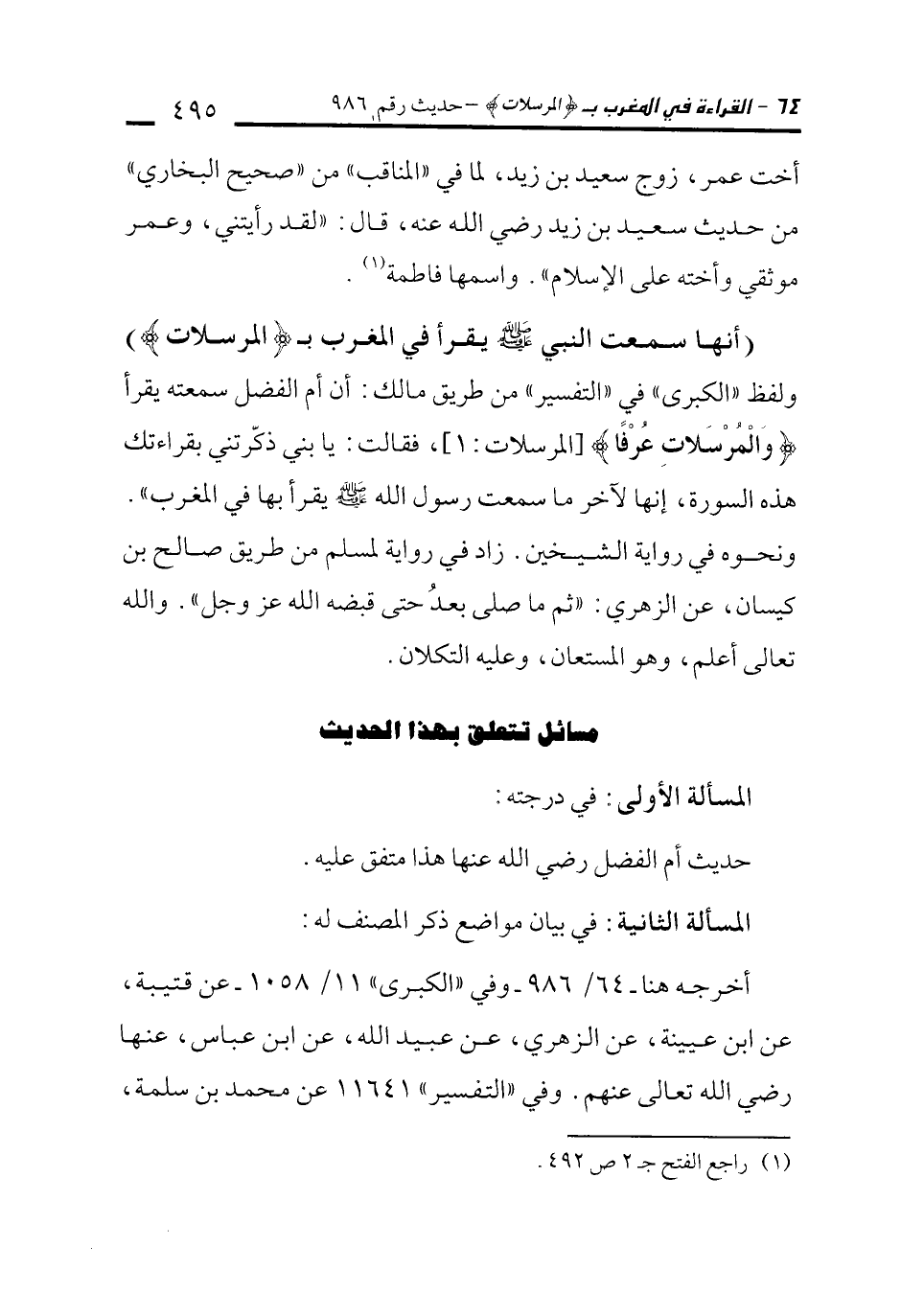 (أنها سمعت النبي - صلى الله عليه وسلم - يقرأ في المغرب بـ {الْمُرْسَلَاتِ}) ولفظ "الكبرى" في "التفسير" من طريق مالك: أن أم الفضل سمعته يقرأ {وَالْمُرْسَلَاتِ عُرْفًا} [المرسلات: 1]، فقالت: يا بني ذكّرتني بقراءتك هذه السورة، إنها لآخر ما سمعت رسول الله - صلى الله عليه وسلم - يقرأ بها في المغرب". ونحوه في رواية الشيخين. زاد في رواية لمسلم من طريق صالح بن كيسان، عن الزهري: "ثم ما صلى بعدُ حتى قبضه الله عز وجل". والله تعالى أعلم، وهو المستعان، وعليه التكلان.
