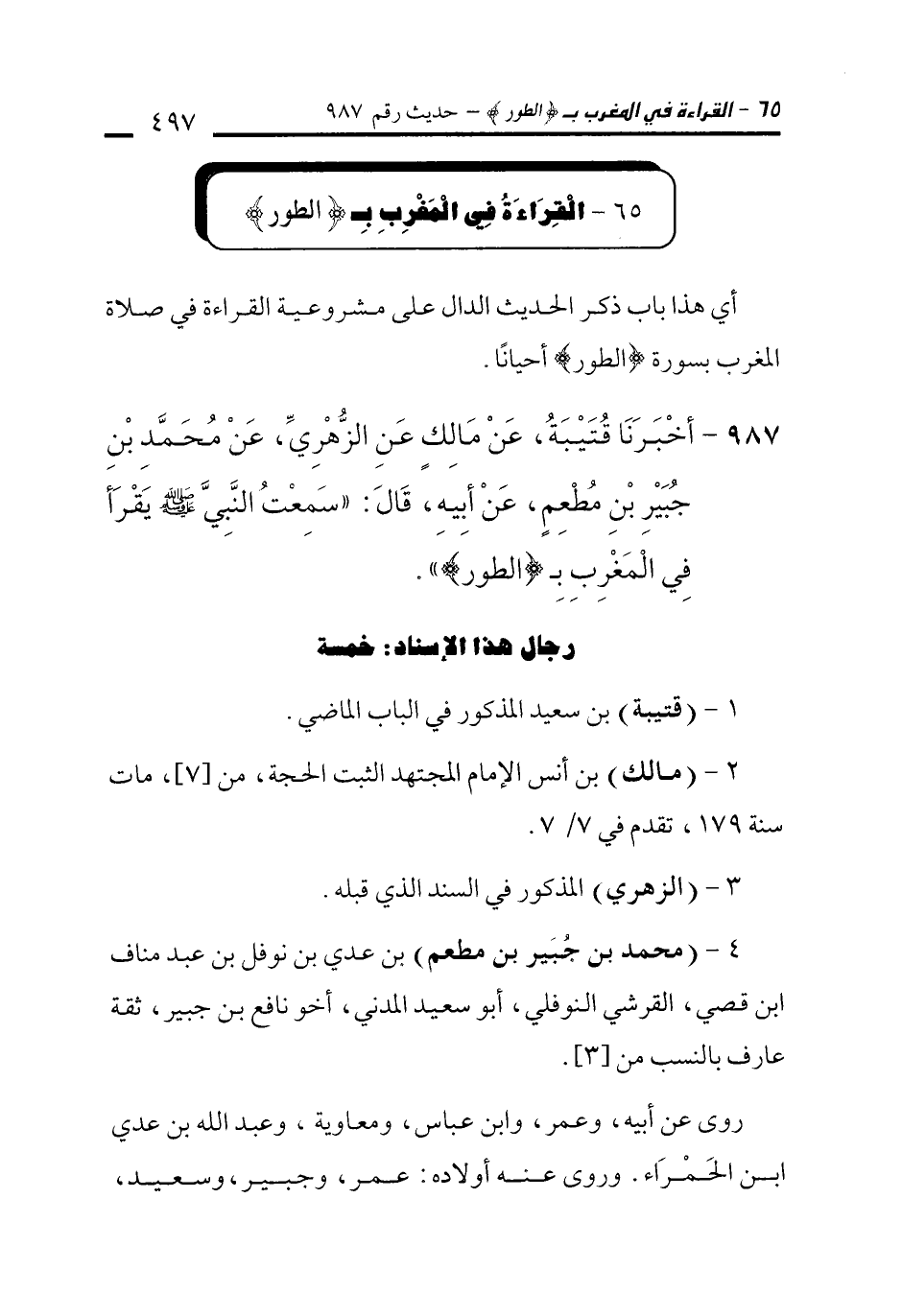 987 - أَخْبَرَنَا قُتَيْبَةُ، عَنْ مَالِكٍ، عَنِ الزُّهْرِيِّ، عَنْ مُحَمَّدِ بْنِ جُبَيْرِ بْنِ مُطْعِمٍ، عَنْ أَبِيهِ، قَالَ: سَمِعْتُ النَّبِيَّ - صلى الله عليه وسلم - يَقْرَأُ فِي الْمَغْرِبِ بِـ {الطُّورِ} ".