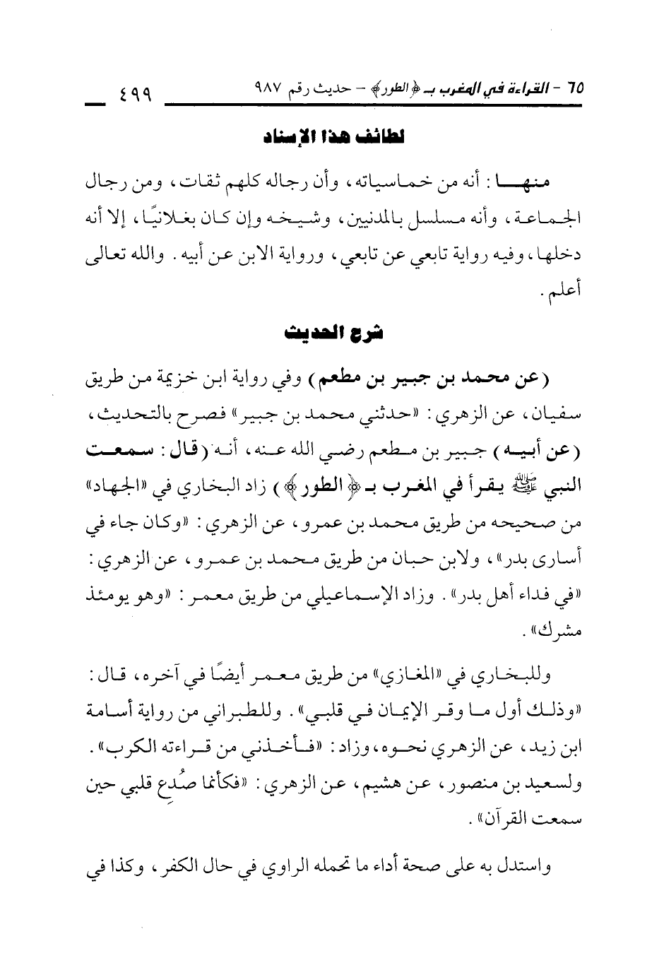 (عن محمد بن جبير بن مطعم) وفي رواية ابن خزيمة من طريق سفيان، عن الزهري: "حدثني محمد بن جبير" فصرح بالتحديث، (عن أبيه) جبير بن مطعم رضي الله عنه، أنه (قال: سمعت النبي - صلى الله عليه وسلم - يقرأ في المغرب بـ {الطُّورِ} زاد البخاري في "الجهاد" من صحيحه من طريق محمد بن عمرو، عن الزهري: "وكان جاء في أسارى بدر"، ولابن حبان من طريق محمد بن عمرو، عن الزهري: "في فداء أهل بدر". وزاد الإسماعيلي من طريق معمر: "وهو يومئذ مشرك".