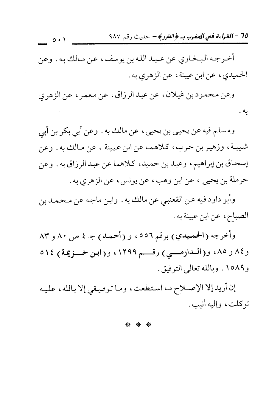 ومسلم فيه عن يحيى بن يحيى، عن مالك به. وعن أبي بكر بن أبي شيبة، وزهير بن حرب، كلاهما عن ابن عيينة، عن مالك به. وعن إسحاق بن إبراهيم، وعبد بن حميد، كلاهما عن عبد الرزاق به. وعن حرملة بن يحيى، عن ابن وهب، عن يونس، عن الزهري به.