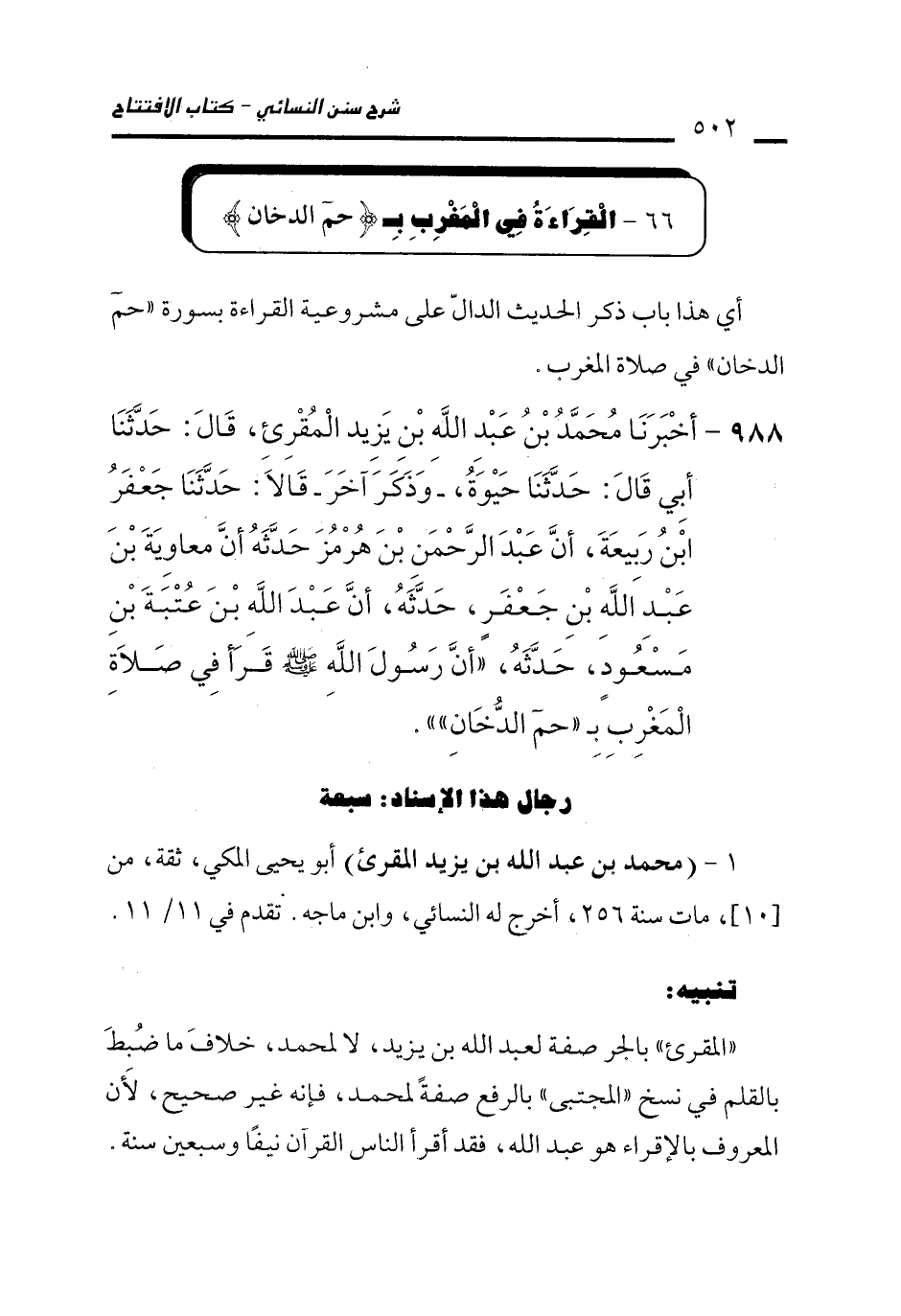 988 - أَخْبَرَنَا مُحَمَّدُ بْنُ عَبْدِ اللَّهِ بْنِ يَزِيدَ الْمُقْرِئُ، قَالَ: حَدَّثَنَا أَبِي قَالَ: حَدَّثَنَا حَيْوَةُ، -وَذَكَرَ آخَرَ- قَالاَ: حَدَّثَنَا جَعْفَرُ بْنُ رَبِيعَةَ، أَنَّ عَبْدَ الرَّحْمَنِ بْنَ هُرْمُزَ حَدَّثَهُ أَنَّ مُعَاوِيَةَ بْنَ عَبْدِ اللَّهِ بْنِ جَعْفَرٍ، حَدَّثَهُ، أَنَّ عَبْدَ اللَّهِ بْنَ عُتْبَةَ بْنِ مَسْعُودٍ، حَدَّثَهُ، "أَنَّ رَسُولَ اللَّهِ - صلى الله عليه وسلم - قَرَأَ فِي صَلاَةِ الْمَغْرِبِ بِـ"حم الدُّخَانِ"".