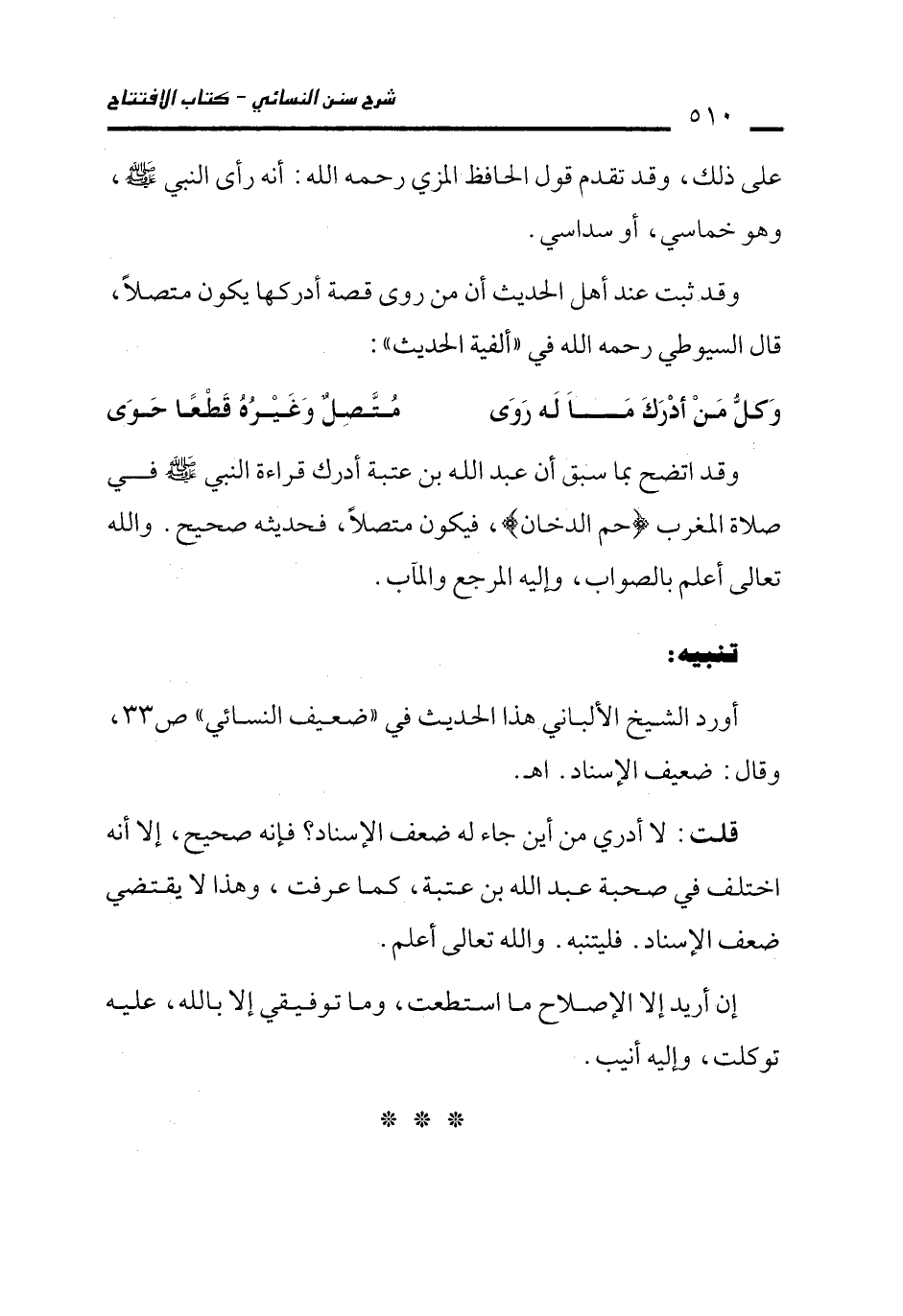 وقد اتضح بما سبق أن عبد الله بن عتبة أدرك قراءة النبي - صلى الله عليه وسلم - في صلاة المغرب {حم الدخان}، فيكون متصلًا، فحديثه صحيح. والله تعالى أعلم بالصواب، وإليه المرجع والمآب.