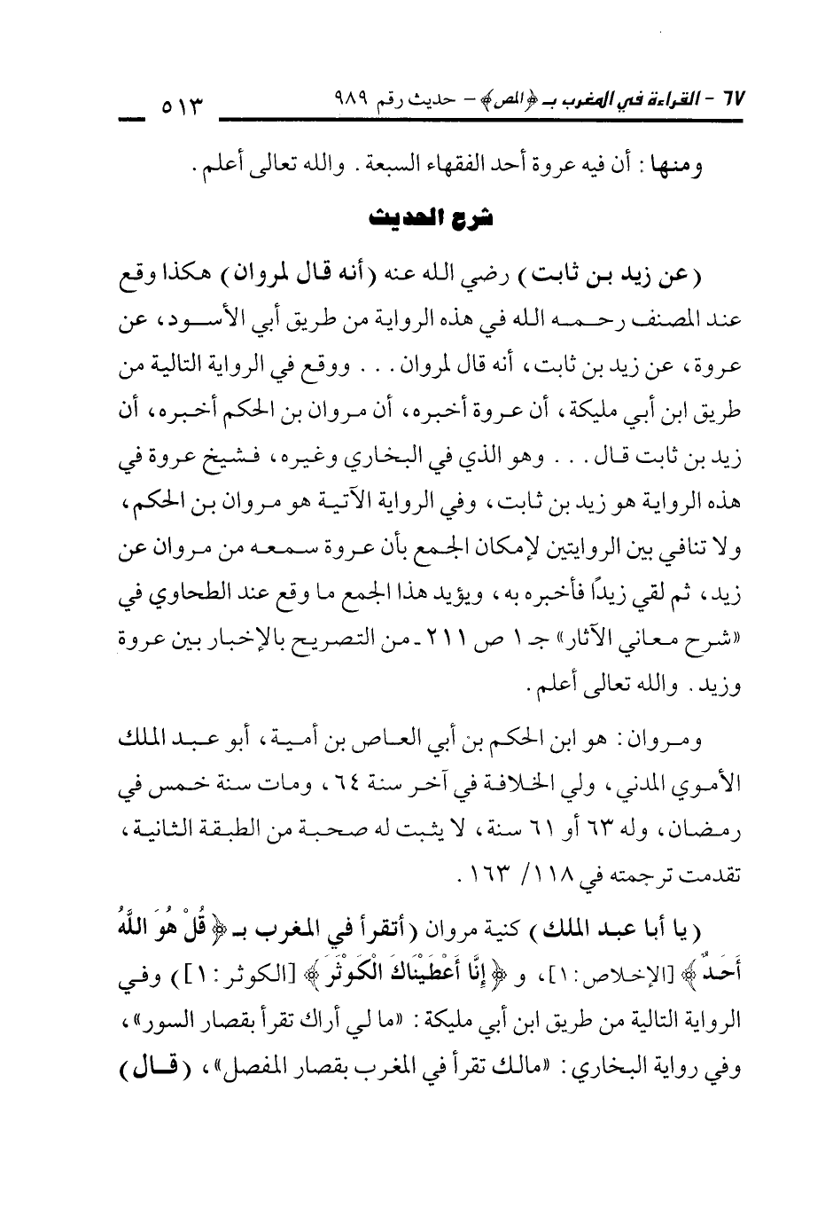(يا أبا عبد الملك) كنية مروان (أتقرأ في المغرب بـ {قُلْ هُوَ اللَّهُ أَحَدٌ} [الإخلاص: 1]، و {إِنَّا أَعْطَيْنَاكَ الْكَوْثَرَ} [الكوثر: 1]) وفي الرواية التالية من طريق ابن أبي مليكة: "ما لي أراك تقرأ بقصار السور"، وفي رواية البخاري: "مالك تقرأ في المغرب بقصار المفصل"، (قال)