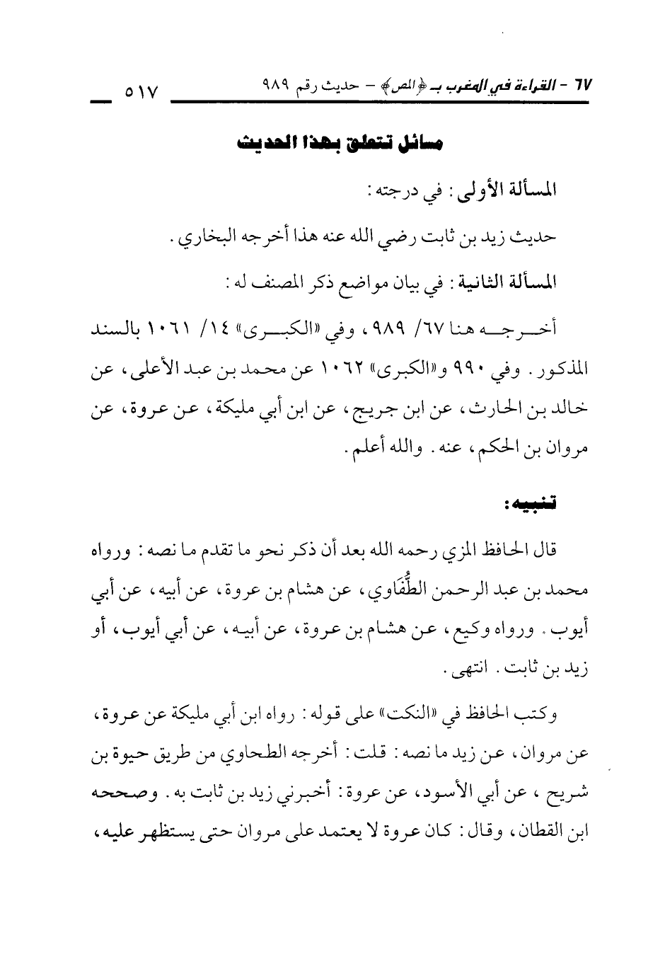 وكتب الحافظ في "النكت" على قوله: رواه ابن أبي مليكة عن عروة، عن مروان، عن زيد ما نصه. قلت أخرجه الطحاوي من طريق حيوة بن شريح، عن أبي الأسود، عن عروة: أخبرني زيد بن ثابت به. وصححه ابن القطان، وقال: كان عروة لا يعتمد على مروان حتى يستظهر عليه،