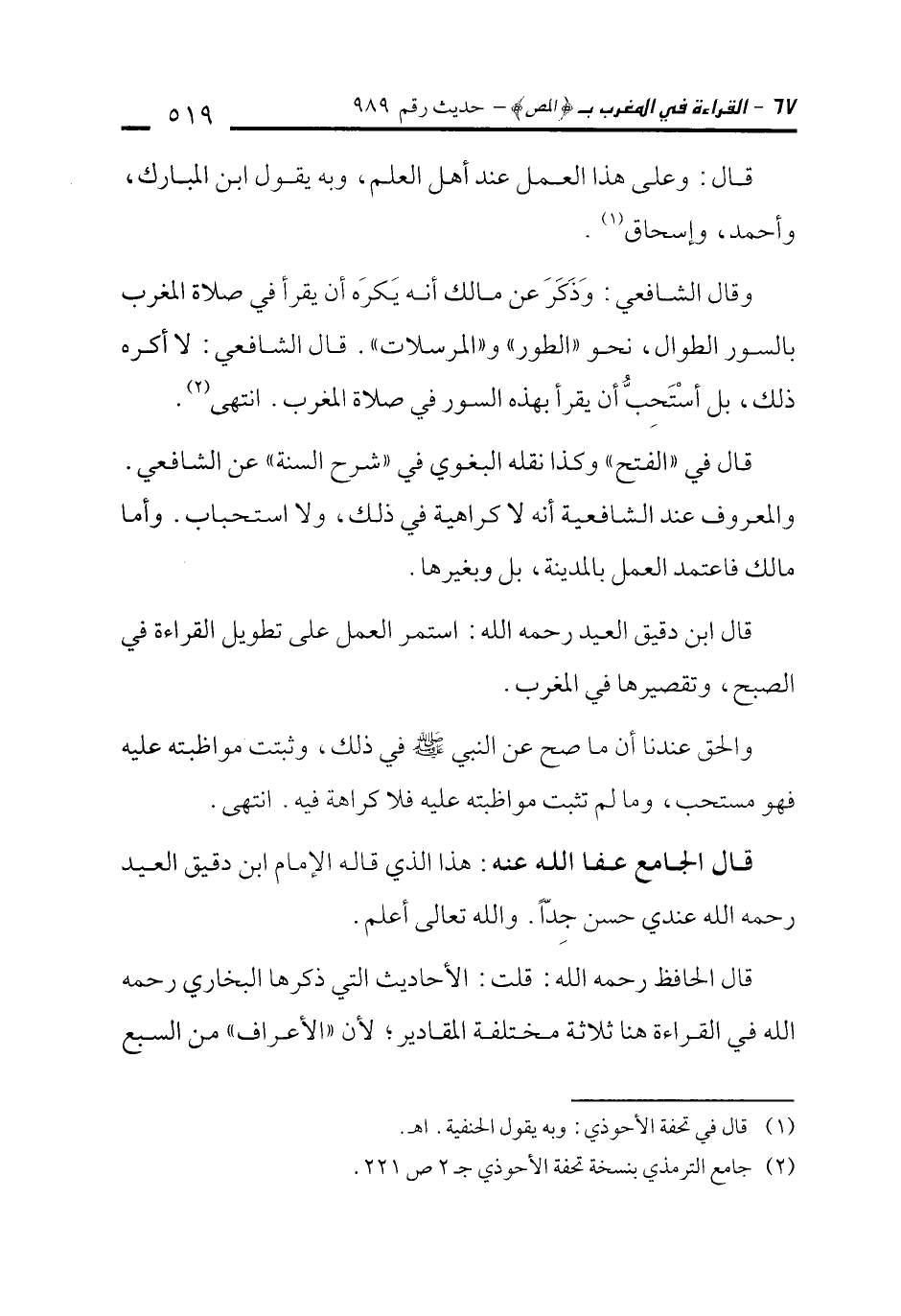 قال الحافظ رحمه الله: قلت: الأحاديث التي ذكرها البخاري رحمه الله في القراءة هنا ثلاثة مختلفة المقادير؛ لأن "الأعراف" من السبع