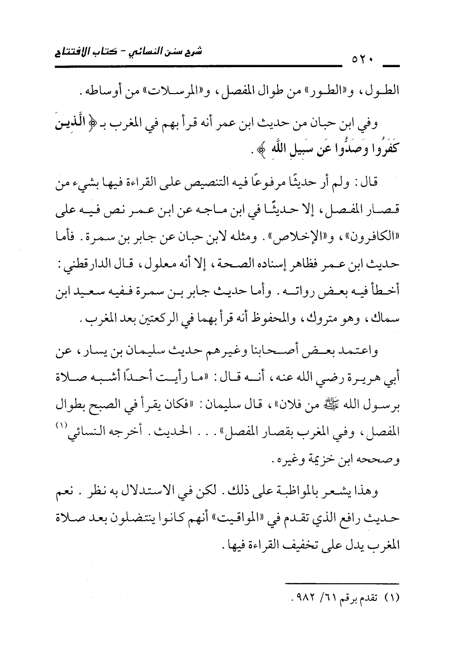 واعتمد بعض أصحابنا وغيرهم حديث سليمان بن يسار، عن أبي هريرة رضي الله عنه، أنه قال: "ما رأيت أحدًا أشبه صلاة برسول الله - صلى الله عليه وسلم - من فلان"، قال سليمان: "فكان يقرأ في الصبح بطوال المفصل، وفي المغرب بقصار المفصل" ... الحديث. أخرجه النسائي (¬1) وصححه ابن خزيمة وغيره.