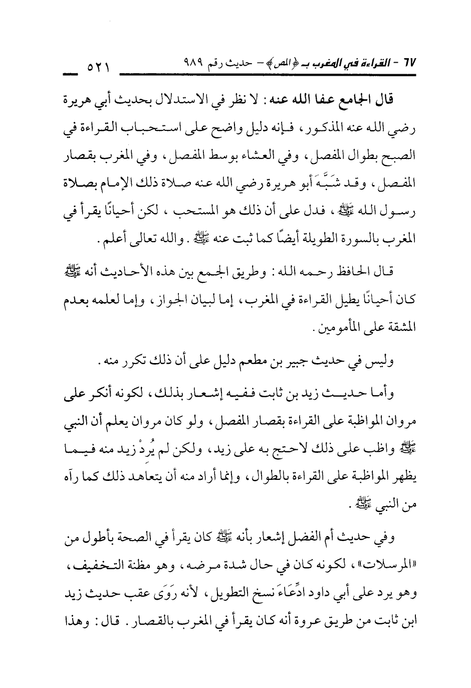 قال الجامع عفا الله عنه: لا نظر في الاستدلال بحديث أبي هريرة رضي الله عنه المذكور، فإنه دليل واضح على استحباب القراءة في الصبح بطوال المفصل، وفي العشاء بوسط المفصل، وفي المغرب بقصار المفصل، وقد شَبَّهَ أبو هريرة رضي الله عنه صلاة ذلك الإمام بصلاة رسول الله - صلى الله عليه وسلم -، فدل على أن ذلك هو المستحب، لكن أحيانًا يقرأ في المغرب بالسورة الطويلة أيضًا كما ثبت عنه - صلى الله عليه وسلم -. والله تعالى أعلم.