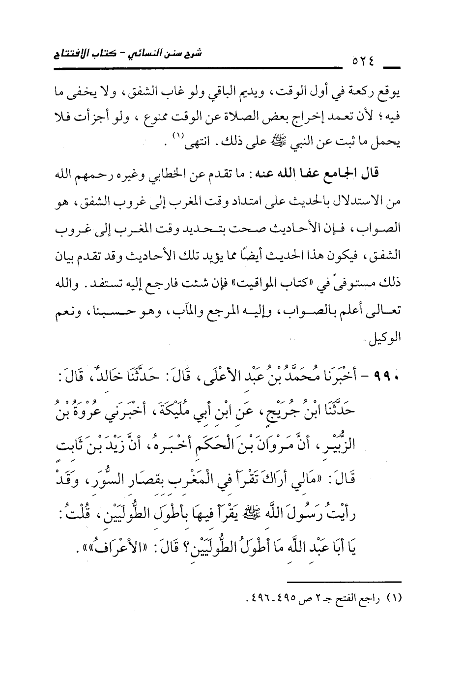 990 - أَخْبَرَنَا مُحَمَّدُ بْنُ عَبْدِ الأَعْلَى، قَالَ: حَدَّثَنَا خَالِدٌ، قَالَ: حَدَّثَنَا ابْنُ جُرَيْجٍ، عَنِ ابْنِ أَبِي مُلَيْكَةَ، أَخْبَرَنِي عُرْوَةُ بْنُ الزُّبَيْرِ، أَنَّ مَرْوَانَ بْنَ الْحَكَمِ أَخْبَرَهُ، أَنَّ زَيْدَ بْنَ ثَابِتٍ قَالَ: "مَا لِي أَرَاكَ تَقْرَأُ فِي الْمَغْرِبِ بِقِصَارِ السُّوَرِ، وَقَدْ رَأَيْتُ رَسُولَ اللَّهِ - صلى الله عليه وسلم - يَقْرَأُ فِيهَا بِأَطْوَلِ الطُّولَيَيْنِ، قُلْتُ: يَا أَبَا عَبْدِ اللَّهِ مَا أَطْوَلُ الطُّولَيَيْنِ؟ قَالَ: "الأَعْرَافُ"".