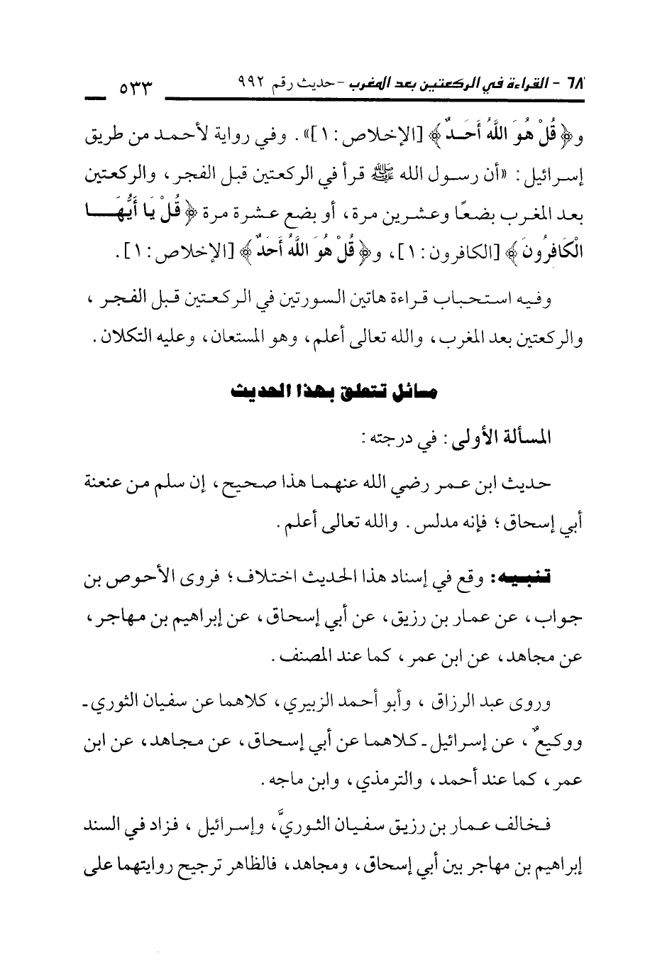 و {قُلْ هُوَ اللَّهُ أَحَدٌ} [الإخلاص: 1] ". وفي رواية لأحمد من طريق إسرائيل: "أن رسول الله - صلى الله عليه وسلم - قرأ في الركعتين قبل الفجر، والركعتين بعد المغرب بضعًا وعشرين مرة، أو بضبع عشرة مرة {قُلْ يَا أَيُّهَا الْكَافِرُونَ} [الكافرون: 1]، و {قُلْ هُوَ اللَّهُ أَحَدٌ} [الإخلاص: 1].