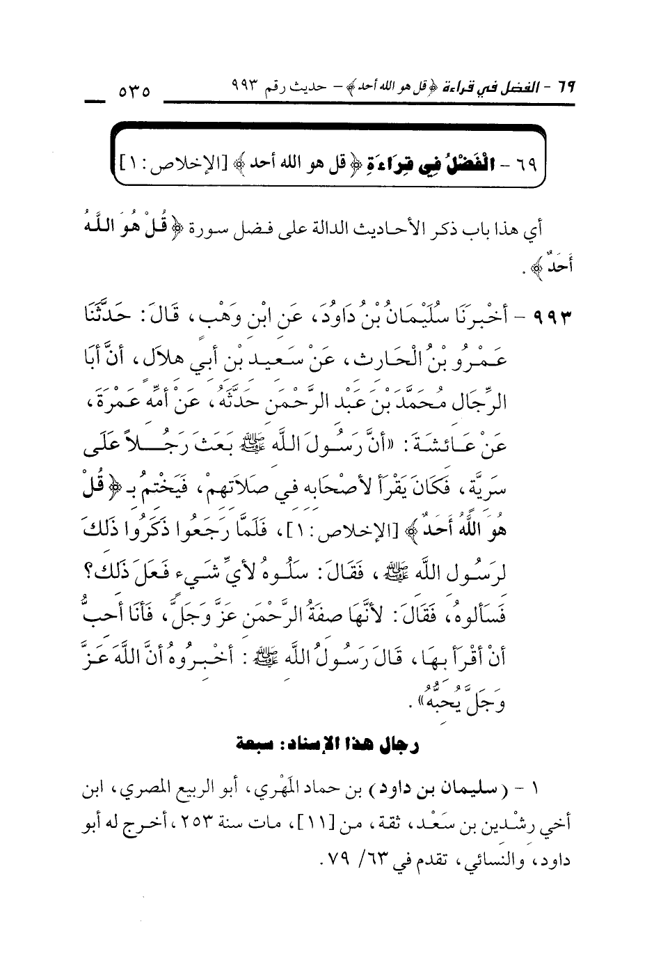 993 - أَخْبَرَنَا سُلَيْمَانُ بْنُ دَاوُدَ، عَنِ ابْنِ وَهْبٍ، قَالَ: حَدَّثَنَا عَمْرُو بْنُ الْحَارِثِ، عَنْ سَعِيدِ بْنِ أَبِي هِلاَلٍ، أَنَّ أَبَا الرِّجَالِ مُحَمَّدَ بْنَ عَبْدِ الرَّحْمَنِ حَدَّثَهُ، عَنْ أُمِّهِ عَمْرَةَ، عَنْ عَائِشَةَ: "أَنَّ رَسُولَ اللَّهِ - صلى الله عليه وسلم - بَعَثَ رَجُلاً عَلَى سَرِيَّةٍ، فَكَانَ يَقْرَأُ لأَصْحَابِهِ فِي صَلاَتِهِمْ، فَيَخْتِمُ بِـ {قُلْ هُوَ اللَّهُ أَحَدٌ (1)} [الإخلاص: 1]، فَلَمَّا رَجَعُوا ذَكَرُوا ذَلِكَ لِرَسُولِ اللَّهِ - صلى الله عليه وسلم -، فَقَالَ: سَلُوهُ لأَيِّ شَيْءٍ فَعَلَ ذَلِكَ؟ فَسَأَلُوهُ، فَقَالَ: لأَنَّهَا صِفَةُ الرَّحْمَنِ عَزَّ وَجَلَّ، فَأَنَا أُحِبُّ أَنْ أَقْرَأَ بِهَا، قَالَ رَسُولُ اللَّهِ - صلى الله عليه وسلم -: "أَخْبِرُوهُ أَنَّ اللَّهَ عَزَّ وَجَلَّ يُحِبُّهُ".