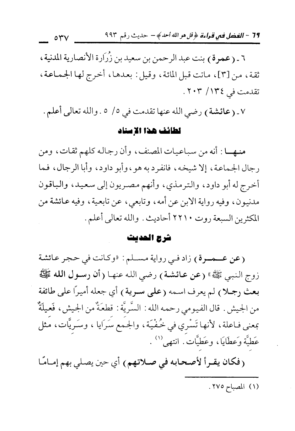 أخرح له أبو داود، والترمذي، وأنهم مصريون إلى سعيد، والباقون مدنيون، وفيه رواية الابن عن أمه، وتابعي، عن تابعية، وفيه عائشة من المكثرين السبعة روت 2210 أحاديث. والله تعالى أعلم.