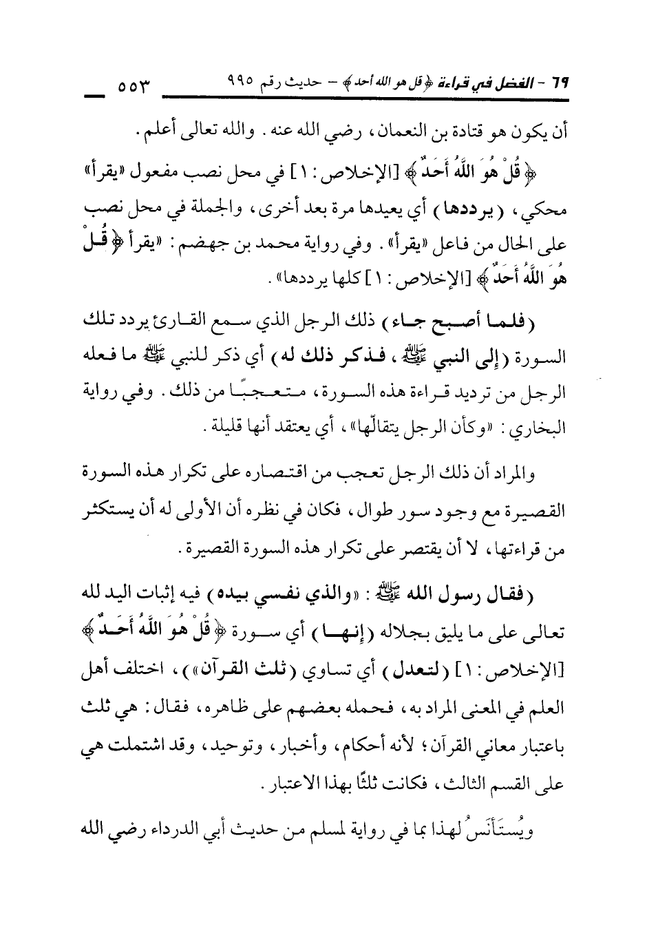 (فقال رسول الله - صلى الله عليه وسلم -: "والذي نفسي بيده) فيه إثبات اليد لله تعالى على ما يليق بجلاله (إِنها) أي سورة {قُلْ هُوَ اللَّهُ أَحَدٌ} [الإخلاص: 1] (لتعدل) أي تساوي (ثلث القرآن")، اختلف أهل العلم في المعنى المراد به، فحمله بعضهم على ظاهره، فقال: هي ثلث باعتبار معاني القرآن؛ لأنه أحكام، وأخبار، وتوحيد، وقد اشتملت هي على القسم الثالث، فكانت ثلثًا بهذا الاعتبار.