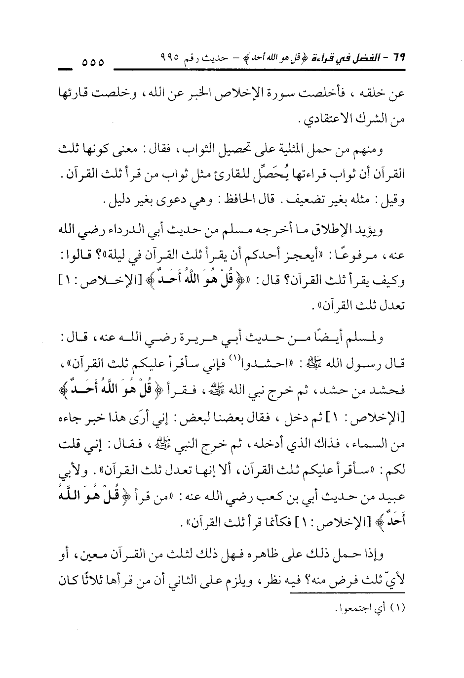 ويؤيد الإطلاق ما أخرجه مسلم من حديث أبي الدرداء رضي الله عنه، مرفوعًا: "أيعجز أحدكم أن يقرأ ثلث القرآن في ليلة"؟ قالوا: وكيف يقرأ ثلث القرآن؟ قال: " {قُلْ هُوَ اللَّهُ أَحَدٌ} [الإخلاص: 1] تعدل ثلث القرآن".