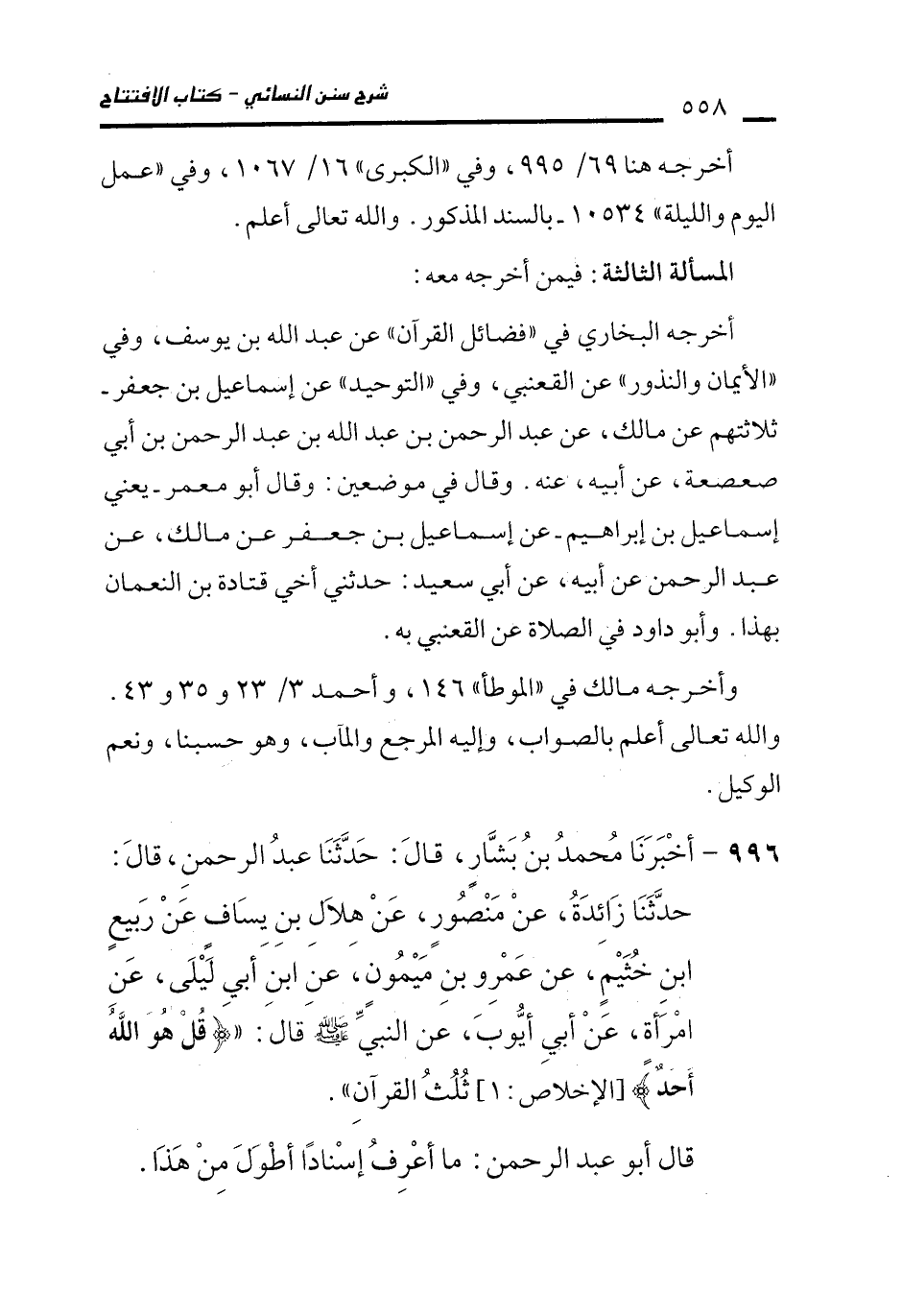 996 - أَخْبَرَنَا مُحَمَّدُ بْنُ بَشَّارٍ، قَالَ: حَدَّثَنَا عَبْدُ الرَّحْمَنِ، قَالَ: حَدَّثَنَا زَائِدَةُ، عَنْ مَنْصُورٍ، عَنْ هِلاَلِ بْنِ يِسَافٍ، عَنْ رَبِيعِ بْنِ خُثَيْمٍ، عَنْ عَمْرِو بْنِ مَيْمُونٍ، عَنِ ابْنِ أَبِي لَيْلَى، عَنِ امْرَأَةٍ، عَنْ أَبِي أَيُّوبَ، عَنِ النَّبِيِّ - صلى الله عليه وسلم - قَالَ: " {قُلْ هُوَ اللَّهُ أَحَدٌ (1)} [الإخلاص: 1] ثُلُثُ الْقُرْآنِ".