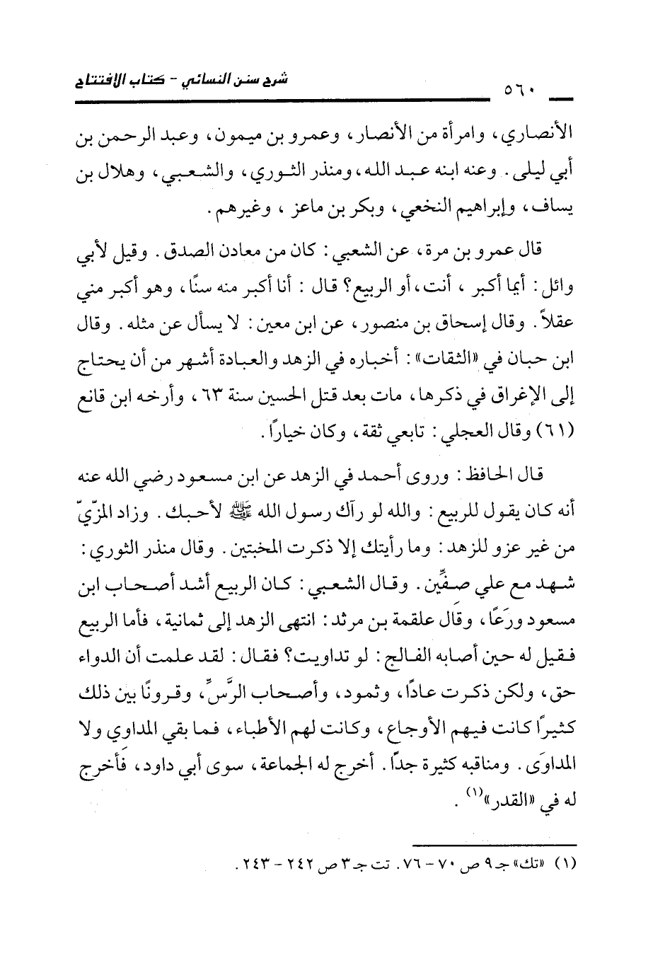 قال الحافظ: وروى أحمد في الزهد عن ابن مسعود رضي الله عنه أنه كان يقول للربيع: والله لو رآك رسول الله - صلى الله عليه وسلم - لأحبك. وزاد المزّيّ من غير عزو للزهد: وما رأيتك إلا ذكرت المخبتين. وقال منذر الثوري: شهد مع علي صفِّين. وقال الشعبي: كان الربيع أشد أصحاب ابن مسعود ورَعًا، وقال علقمة بن مرثد: انتهى الزهد إلى ثمانية، فأما الربيع فقيل له حين أصابه الفالح: لو تداويت؟ فقال: لقد علمت أن الدواء حق، ولكن ذكرت عادًا، وثمود، وأصحاب الرَّسِّ، وقرونًا بين ذلك كثيرًا كانت فيهم الأوجاع، وكانت لهم الأطباء، فما بقي المداوي ولا المداوَى. ومناقبه كثيرة جدًا. أخرج له الجماعة، سوى أبي داود، فأخرج له في "القدر" (¬1).