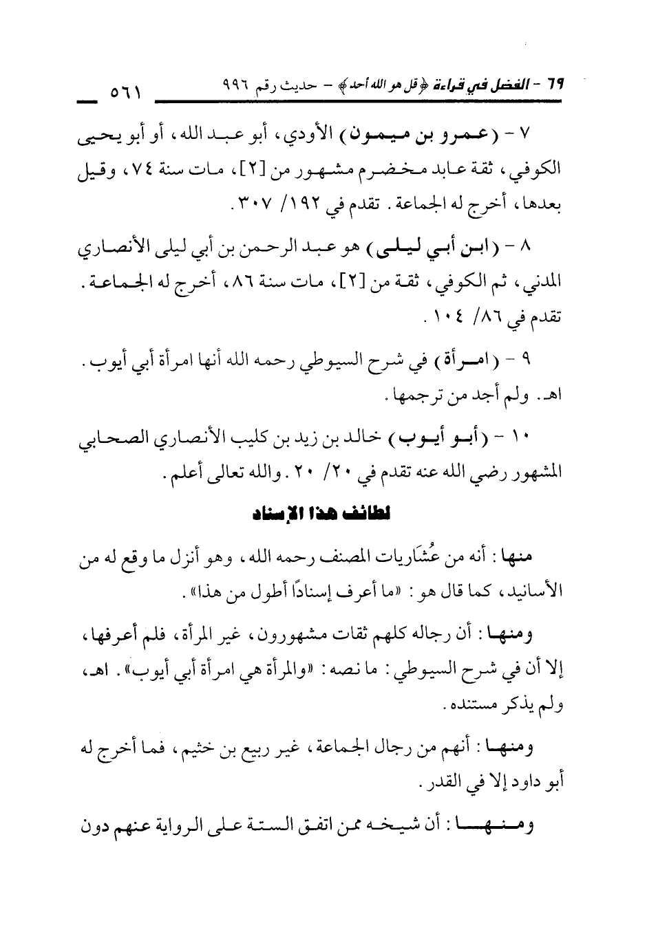 ومنها: أن رجاله كلهم ثقات مشهورون، غير المرأة، فلم أعرفها، إلا أن في شرح السيوطي: ما نصه: "والمرأة هي امرأة أبي أيوب". اهـ، ولم يذكر مستنده.