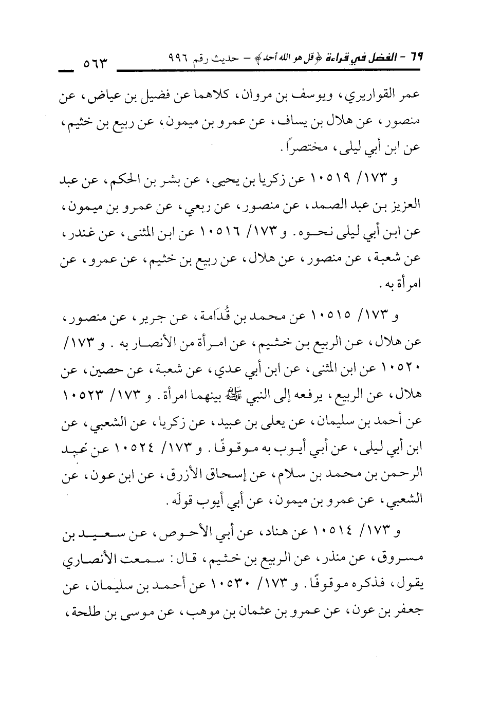 و173/ 10519 عن زكريا بن يحيى، عن بشر بن الحكم، عن عبد العزيز بن عبد الصمد، عن منصور، عن ربعي، عن عمرو بن ميمون، عن ابن أبي ليلى نحوه. و 173/ 10516 عن ابن المثنى، عن غندر، عن شعبة، عن منصور، عن هلال، عن ربيع بن خثيم، عن عمرو، عن امرأة به.