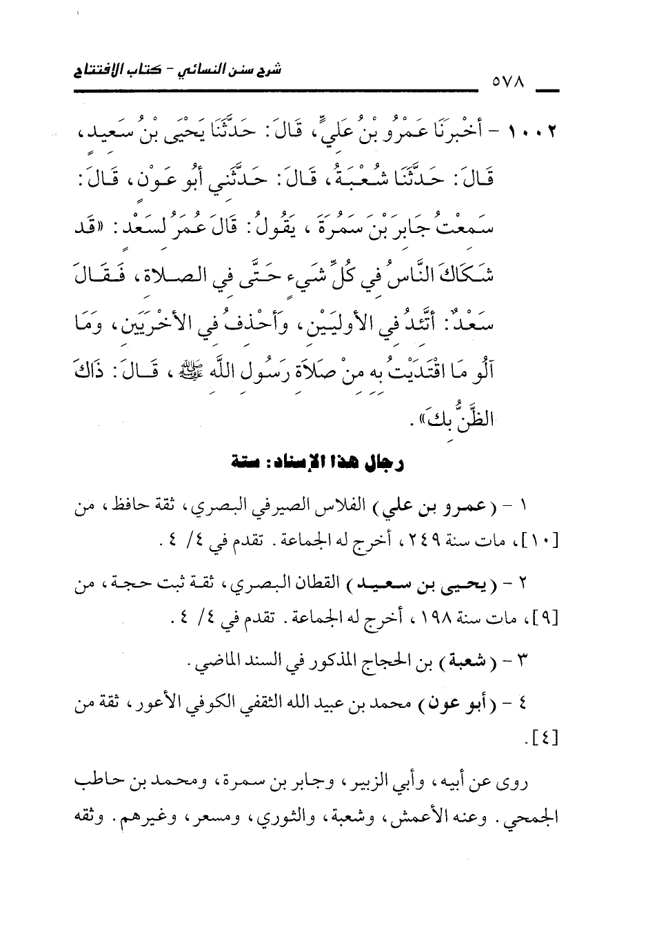 1002 - أَخْبَرَنَا عَمْرُو بْنُ عَلِيٍّ، قَالَ: حَدَّثَنَا يَحْيَى بْنُ سَعِيدٍ، قَالَ: حَدَّثَنَا شُعْبَةُ، قَالَ: حَدَّثَنِي أَبُو عَوْنٍ، قَالَ: سَمِعْتُ جَابِرَ بْنَ سَمُرَةَ، يَقُولُ: قَالَ عُمَرُ لِسَعْدٍ: "قَدْ شَكَاكَ النَّاسُ فِي كُلِّ شَيءٍ حَتَّى فِي الصَّلاَةِ، فَقَالَ سَعْدٌ: أَتَّئِدُ فِي الأُولَيَيْنِ، وَأَحْذِفُ فِي الأُخْرَيَيْنِ، وَمَا آلُو مَا اقْتَدَيْتُ بِهِ مِنْ صَلاَةِ رَسُولِ اللَّهِ - صلى الله عليه وسلم -، قَالَ ذَاكَ الظَّنُّ بِكَ".
