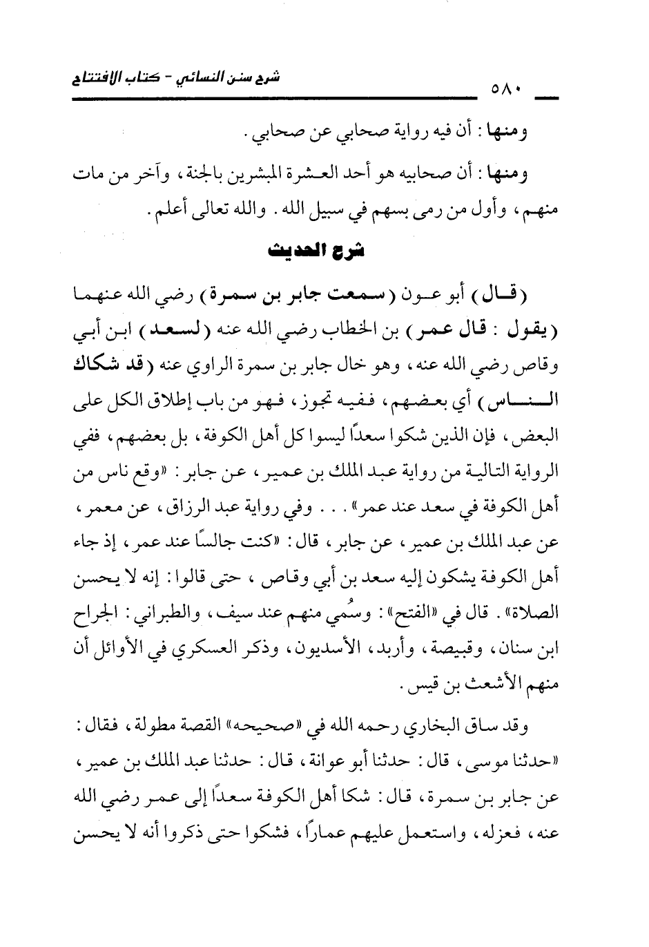 وقد ساق البخاري رحمه الله في "صحيحه" القصة مطولة، فقال: "حدثنا موسى، قال: حدثنا أبو عوانة، قال: حدثنا عبد الملك بن عمير، عن جابر بن سمرة، قال: شكا أهل الكوفة سعدًا إلى عمر رضي الله عنه، فعزله، واستعمل عليهم عمارًا، فشكوا حتى ذكروا أنه لا يحسن
