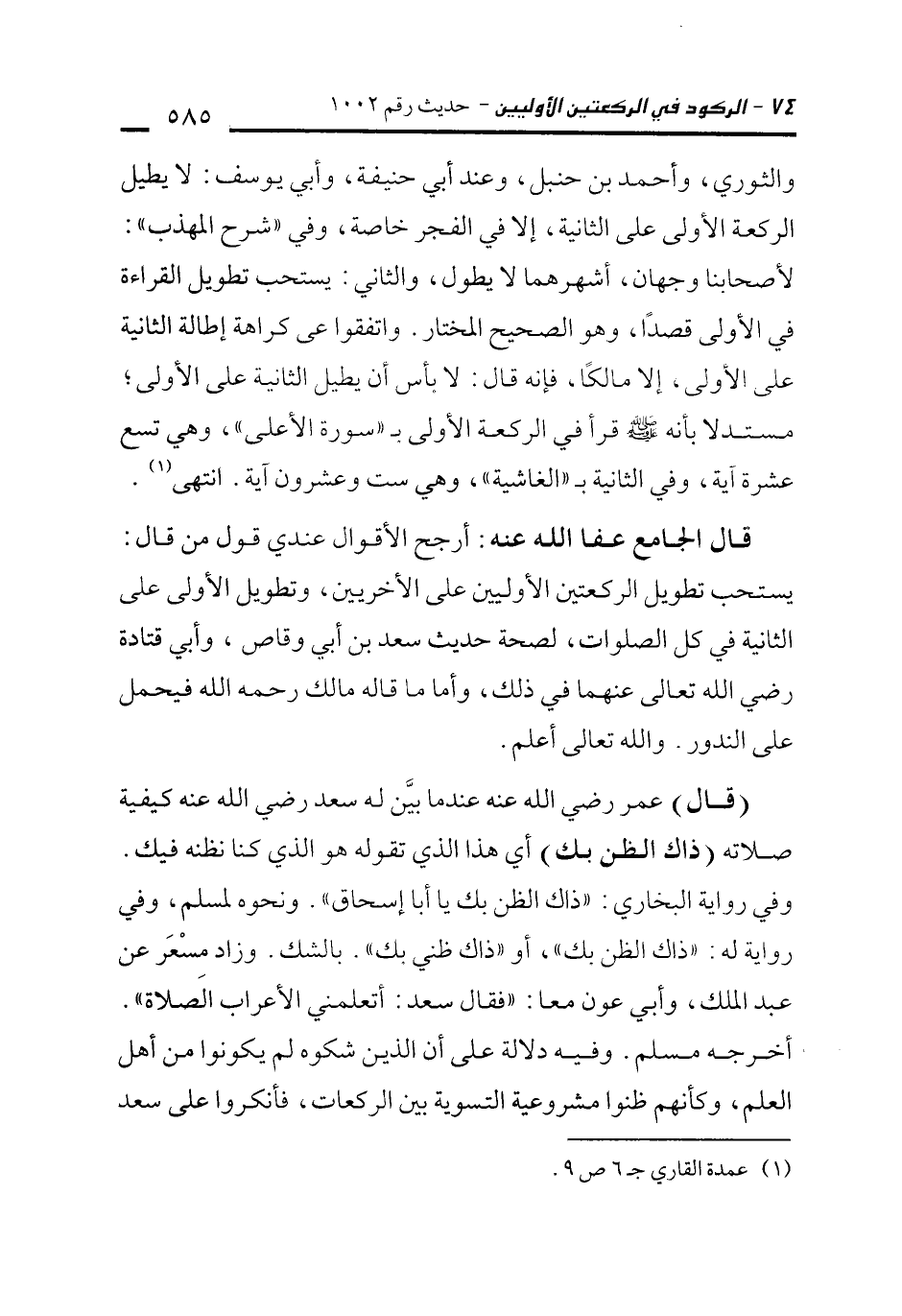 والثوري، وأحمد بن حنبل، وعند أبي حنيفة، وأبي يوسف: لا يطيل الركعة الأولى على الثانية، إلا في الفجر خاصة، وفي "شرح المهذب": لأصحابنا وجهان، أشهرهما لا يطول، والثاني: يستحب تطويل القراءة في الأولى قصدًا، وهو الصحيح المختار. واتفقوا عى كراهة إطالة الثانية على الأولى، إلا مالكًا, فإنه قال: لا بأس أن يطيل الثانية على الأولى؛ مستدلا بأنه - صلى الله عليه وسلم - قرأ في الركعة الأولى بـ"سورة الأعلى"، وهي تسع عشرة آية، وفي الثانية بـ"الغاشية"، وهي ست وعشرون آية. انتهى (¬1).