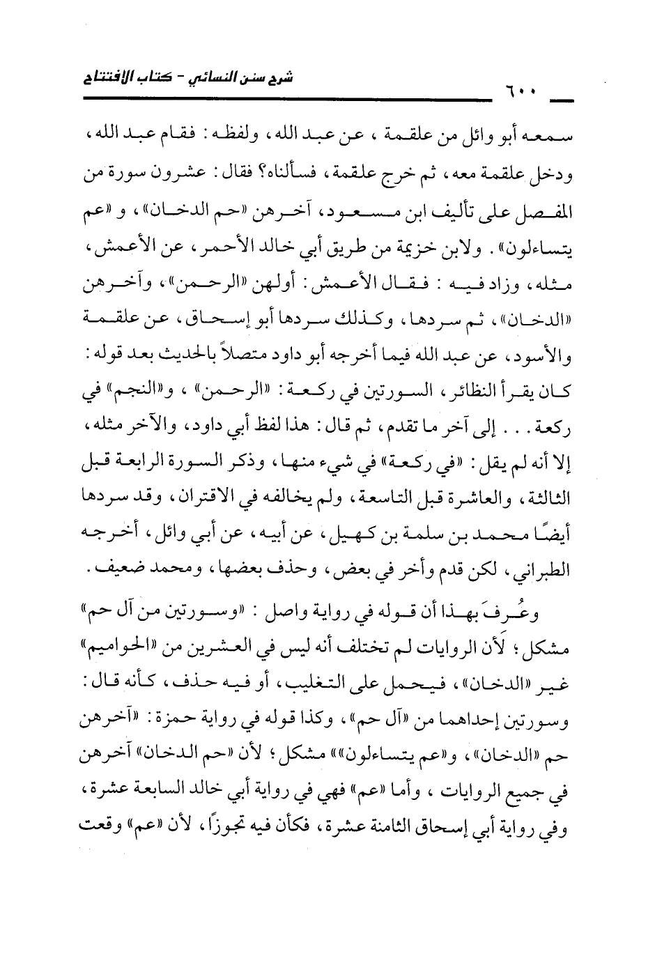 سمعه أبو وائل من علقمة، عن عبد الله، ولفظه: فقام عبد الله، ودخل علقمة معه، ثم خرج علقمة، فسألناه؟ فقال: عشرون سورة من المفصل على تأليف ابن مسعود، آخرهن "حم الدخان"، و"عم يتساءلون". ولابن خزيمة من طريق أبي خالد الأحمر، عن الأعمش، مثله، وزاد فيه: فقال الأعمش: أولهن "الرحمن"، وآخرهن "الدخان"، ثم سردها، وكذلك سردها أبو إسحاق، عن علقمة والأسود، عن عبد الله فيما أخرجه أبو داود متصلًا بالحديث بعد قوله: كان يقرأ النظائر، السورتين في ركعة: "الرحمن"، و"النجم" في ركعة. . . إلى آخر ما تقدم، ثم قال: هذا لفظ أبي داود، والآخر مثله، إلا أنه لم يقل: "في ركعة" في شيء منها، وذكر السورة الرابعة قبل الثالثة، والعاشرة قبل التاسعة، ولم يخالفه في الاقتران، وقد سردها أيضًا محمد بن سلمة بن كهيل، عن أبيه، عن أبي وائل، أخرجه الطبراني، لكن قدم وأخر في بعض، وحذف بعضها، ومحمد ضعيف.