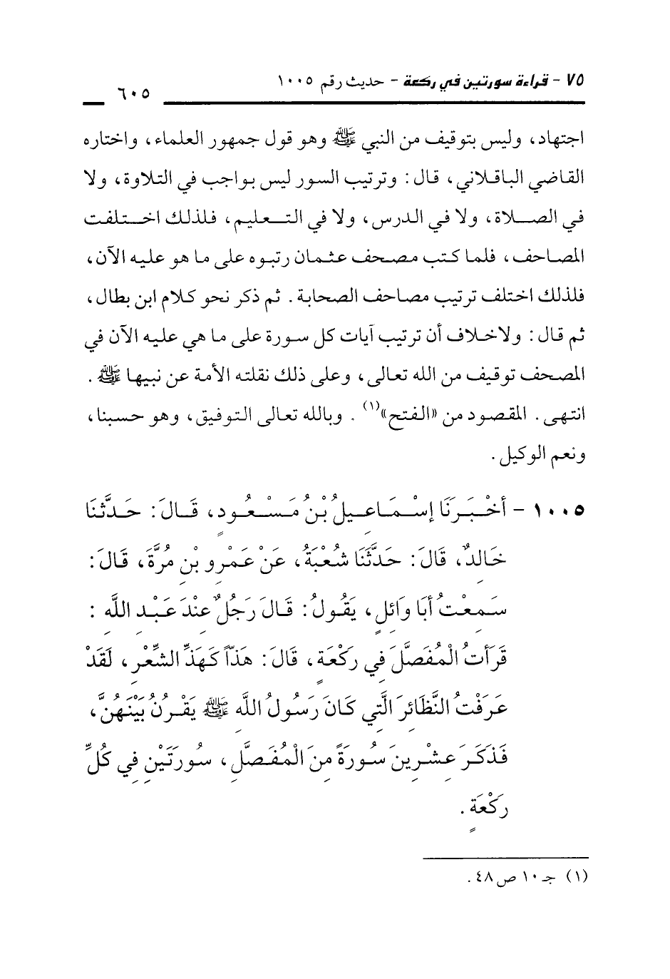 1005 - أَخْبَرَنَا إِسْمَاعِيلُ بْنُ مَسْعُودٍ، قَالَ: حَدَّثَنَا خَالِدٌ، قَالَ: حَدَّثَنَا شُعْبَةُ، عَنْ عَمْرِو بْنِ مُرَّةَ، قَالَ: سَمِعْتُ أَبَا وَائِلٍ، يَقُولُ: قَالَ رَجُلٌ عِنْدَ عَبْدِ اللَّهِ: قَرَأْتُ الْمُفَصَّلَ فِي رَكْعَةٍ، قَالَ: هَذًّا كَهَذِّ الشِّعْرِ، لَقَدْ عَرَفْتُ النَّظَائِرَ الَّتِي كَانَ رَسُولُ اللَّهِ - صلى الله عليه وسلم - يَقْرُنُ بَيْنَهُنَّ، فَذَكَرَ عِشْرِينَ سُورَةً مِنَ الْمُفَصَّلِ، سُورَتَيْنِ سُورَتَيْنِ فِي كُلِّ رَكْعَةٍ.