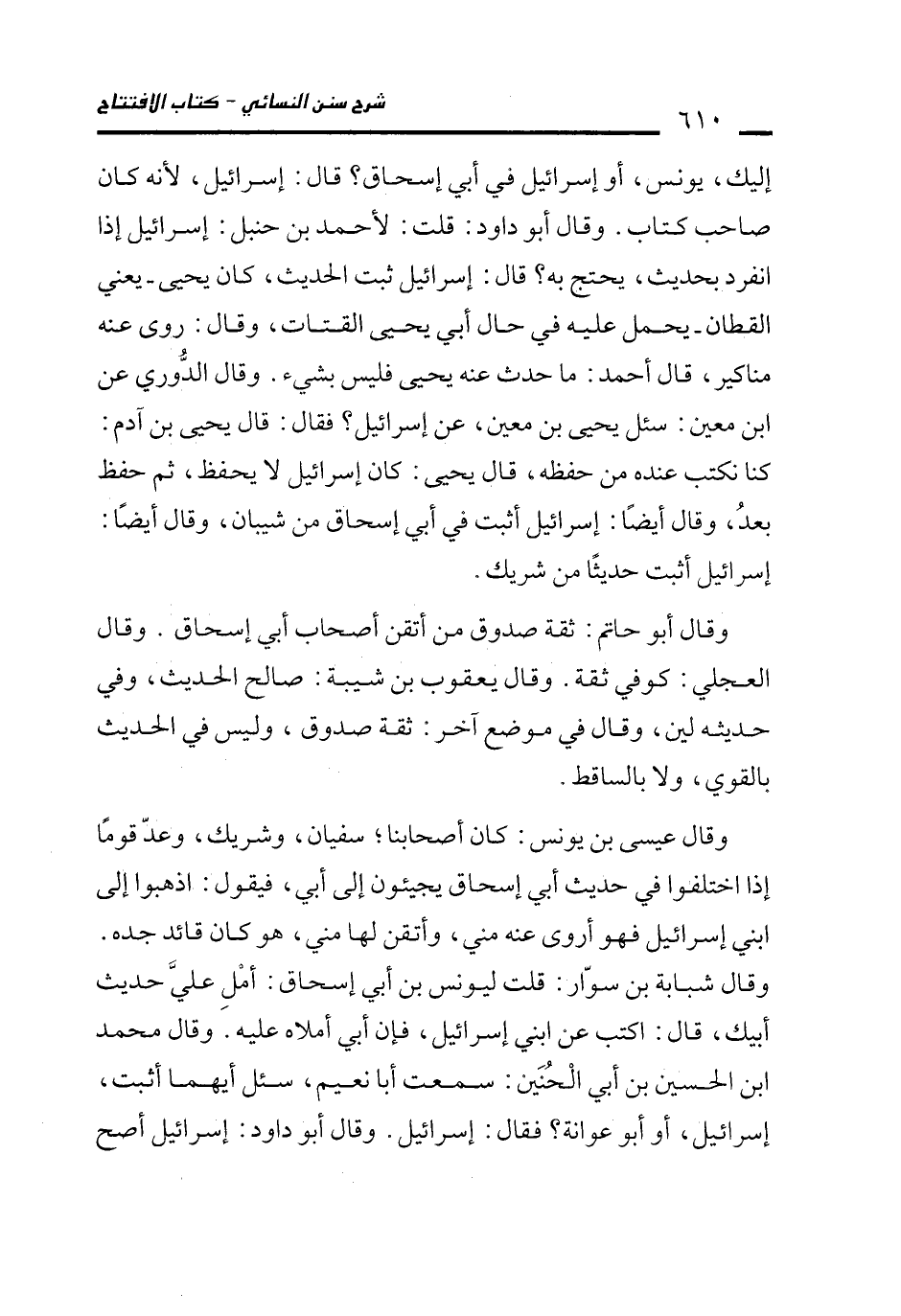 إليك، يونس، أو إسرائيل في أبي إسحاق؟ قال: إسرائيل, لأنه كان صاحب كتاب. وقال أبو داود: قلت: لأحمد بن حنبل: إسرائيل إذا انفرد بحديث، يحتج به؟ قال: إسرائيل ثبت الحديث، كان يحيى -يعني القطان- يحمل عليه في حال أبي يحيى القتات، وقال: روى عنه مناكير، قال أحمد: ما حدث عنه يحيى فليس بشيء. وقال الدُّوري عن ابن معين: سئل يحيى بن معين، عن إسرائيل؟ فقال: قال يحيى بن آدم: كنا نكتب عنده من حفظه, قال يحيى: كان إسرائيل لا يحفظ، ثم حفظ بعدُ، وقال أيضًا: إسرائيل أثبت في أبي إسحاق من شيبان، وقال أيضًا: إسرائيل أثبت حديثًا من شريك.