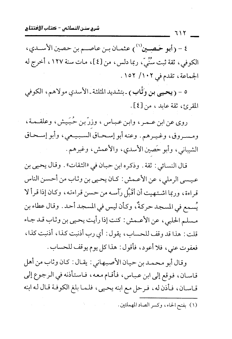 5 - (يحيى بن وَثَّاب) -بتشديد المثلثة- الأسدي مولاهم، الكوفي المقرئ، ثقة عابد، من [4].