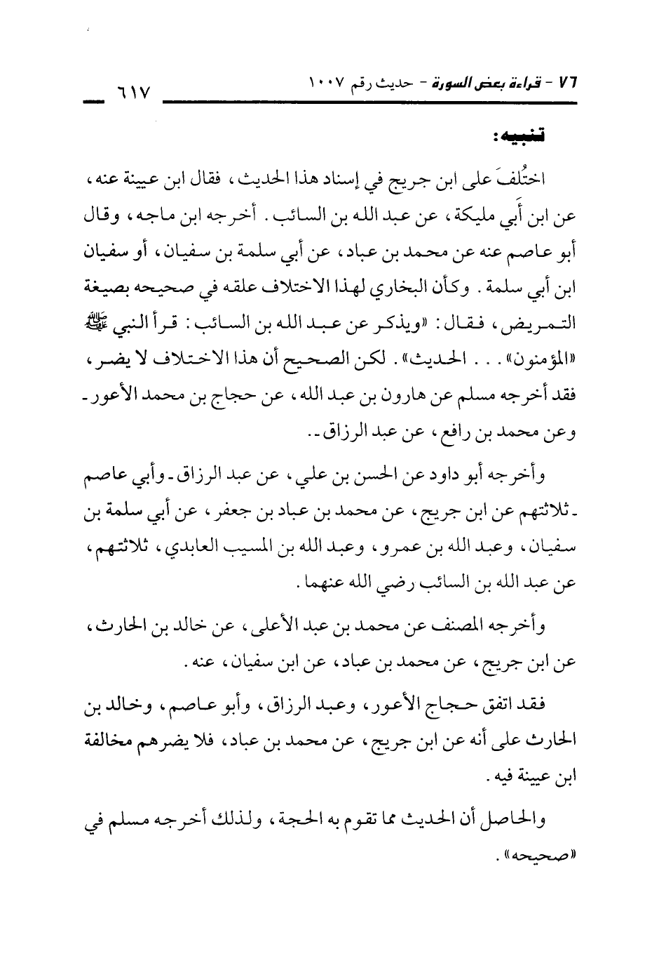 اختُلِفَ على ابن جريج في إسناد هذا الحديث، فقال ابن عيينة عنه، عن ابن أبي مليكة، عن عبد الله بن السائب. أخرجه ابن ماجه، وقال أبو عاصم عنه عن محمد بن عباد، عن أبي سلمة بن سفيان، أو سفيان ابن أبي سلمة. وكأن البخاري لهذا الاختلاف علقه في صحيحه بصيغة التمريض، فقال: "ويذكر عن عبد الله بن السائب: قرأ النبي - صلى الله عليه وسلم - "المؤمنون" ... الحديث". لكن الصحيح أن هذا الاختلاف لا يضر، فقد أخرجه مسلم عن هارون بن عبد الله، عن حجاج بن محمد الأعور - وعن محمد بن رافع، عن عبد الرزاق -.