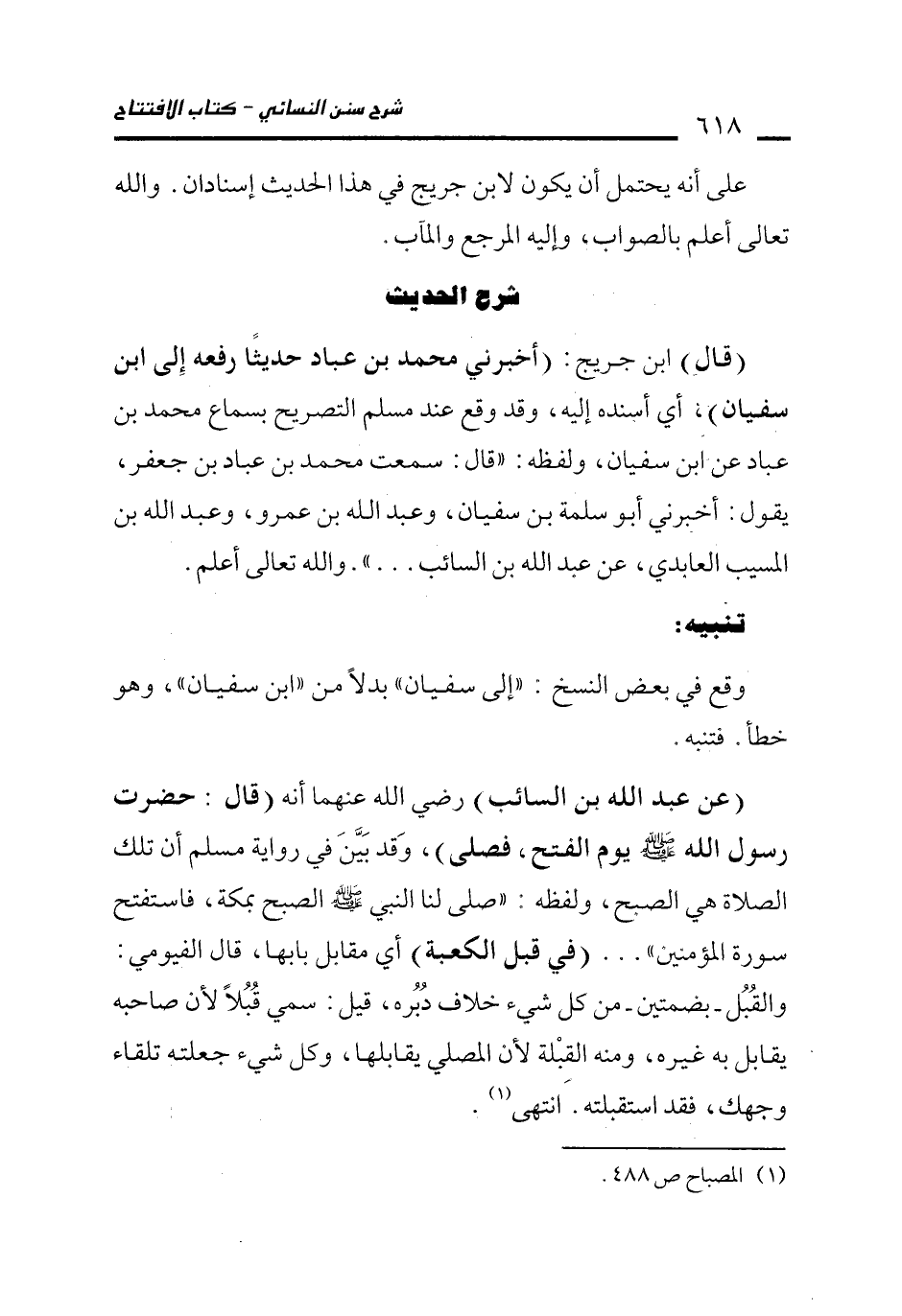 (عن عبد الله بن السائب) رضي الله عنهما أنه (قال: حضرت رسول الله - صلى الله عليه وسلم - يوم الفتح، فصلى)، وَقَد بَينَ في رواية مسلم أن تلك الصلاة هي الصبح، ولفظه: "صلى لنا النبي - صلى الله عليه وسلم - الصبح بمكة، فاستفتح سورة المؤمنين". . . (في قبل الكعبة) أي مقابل بابها، قال الفيومي: والقُبُل -بضمتين- من كل شيء خلاف دُبُره، قيل: سمي قُبُلًا لأن صاحبه يقابل به غيره، ومنه القبْلة لأن المصلي يقابلها، وكل شيء جعلته تلقاء وجهك، فقد استقبلته. انتهى (¬1).