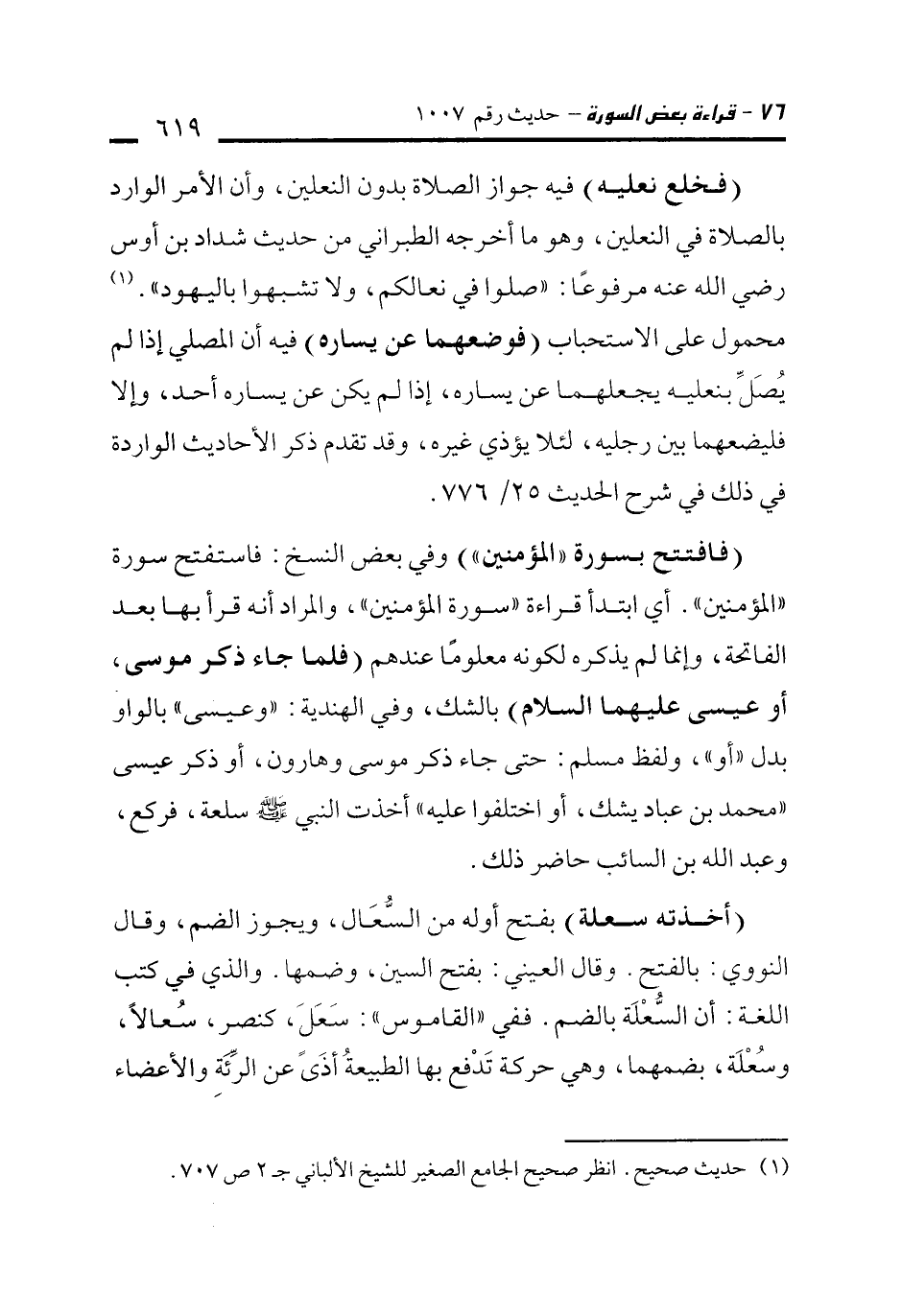 (فخلع نعليه) فيه جواز الصلاة بدون النعلين، وأن الأمر الوارد بالصلاة في النعلين، وهو ما أخرجه الطبراني من حديث شداد بن أوس رضي الله عنه مرفوعًا: "صلوا في نعالكم، ولا تشبهوا باليهود". (¬1) محمول على الاستحباب (فوضعهما عن يساره) فيه أن المصلي إذا لم يُصَلِّ بنعليه يجعلهما عن يساره، إذا لم يكن عن يساره أحد، وإلا فليضعهما بين رجليه، لئلا يؤدي غيره، وقد تقدم ذكر الأحاديث الواردة في ذلك في شرح الحديث 25/ 776.