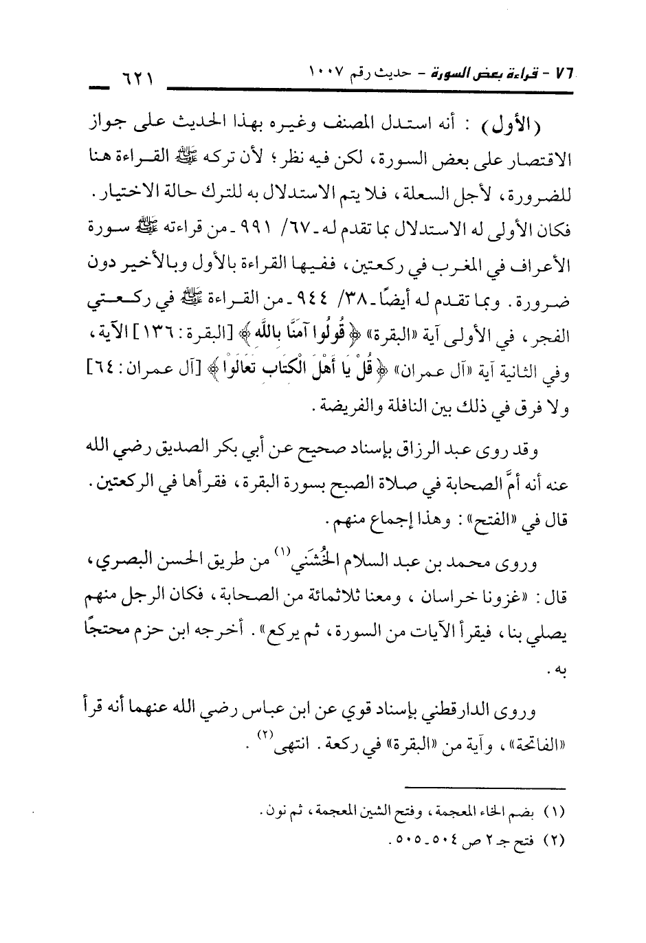 (الأول): أنه استدل المصنف وغيره بهذا الحديث على جواز الاقتصار على بعض السورة، لكن فيه نظر؛ لأن تركه - صلى الله عليه وسلم - القراءة هنا للضرورة، لأجل السعلة، فلا يتم الاستدلال به للترك حالة الاختيار. فكان الأولى له الاستدلال بما تقدم له -67/ 991 - من قراءته - صلى الله عليه وسلم - سورة الأعراف في المغرب في ركعتين، ففيها القراءة بالأول وبالأخير دون ضرورة. وبما تقدم له أيضًا -38/ 944 - من القراءة - صلى الله عليه وسلم - في ركعتي الفجر، في الأولى آية "البقرة" {قُولُوا آمَنَّا بِاللَّهِ} [البقرة: 136] الآية، وفي الثانية آية "آل عمران" {قُلْ يَا أَهْلَ الْكِتَابِ تَعَالَوْا} [آل عمران: 64] ولا فرق في ذلك بن النافلة والفريضة.