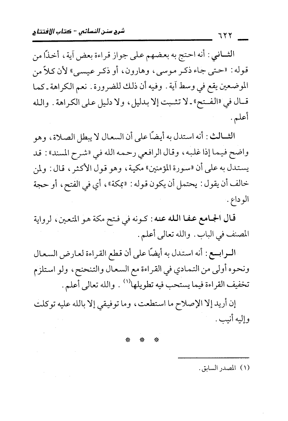 الرابع: أنه استدل به أيضًا على أن قطع القراءة لعارض السعال ونحوه أولى من التمادي في القراءة مع السعال والتنحنح، ولو استلزم تخفيف القراءة فيما يستحب فيه تطويلها (¬1). والله تعالى أعلم.