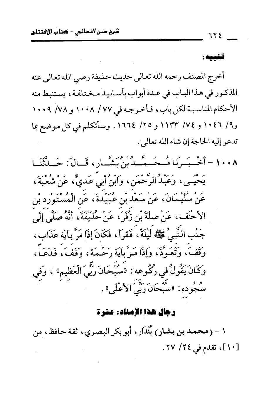 1008 - أَخْبَرَنَا مُحَمَّدُ بْنُ بَشَّارٍ، قَالَ: حَدَّثَنَا يَحْيَى، وَعَبْدُ الرَّحْمَنِ، وَابْنُ أَبِي عَدِيٍّ، عَنْ شُعْبَةَ، عَنْ سُلَيْمَانَ، عَنْ سَعْدِ بْنِ عُبَيْدَةَ، عَنِ الْمُسْتَوْرِدِ بْنِ الأَحْنَفِ، عَنْ صِلَةَ بْنِ زُفَرَ، عَنْ حُذَيْفَةَ، أَنَّهُ صَلَّى إِلَى جَنْبِ النَّبِيِّ - صلى الله عليه وسلم - لَيْلَةً، فَقَرَأَ، فَكَانَ إِذَا مَرَّ بِآيَةِ عَذَابٍ، وَقَفَ، وَتَعَوَّذَ، وَإِذَا مَرَّ بِآيَةِ رَحْمَةٍ، وَقَفَ، فَدَعَا، وَكَانَ يَقُولُ فِي رُكُوعِهِ: "سُبْحَانَ رَبِّيَ الْعَظِيمِ"، وَفِي سُجُودِهِ: "سُبْحَانَ رَبِّيَ الأَعْلَى".