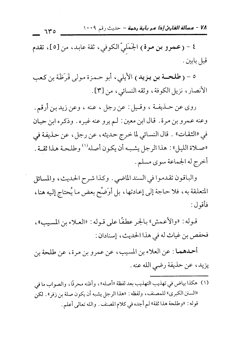 (¬1) هكذا بياض في تهذيب التهذيب بعد لفظة "أصله"، وأظنه محرفًا، والصواب ما في "السنن الكبرى" للمصنف، ولفظه: "هذا الرجل يشبه أن يكون صلة بن زفر". لكن قوله: "وطلحة هذا ثقة" لم أجده في كلام المصنف. والله تعالى أعلم.