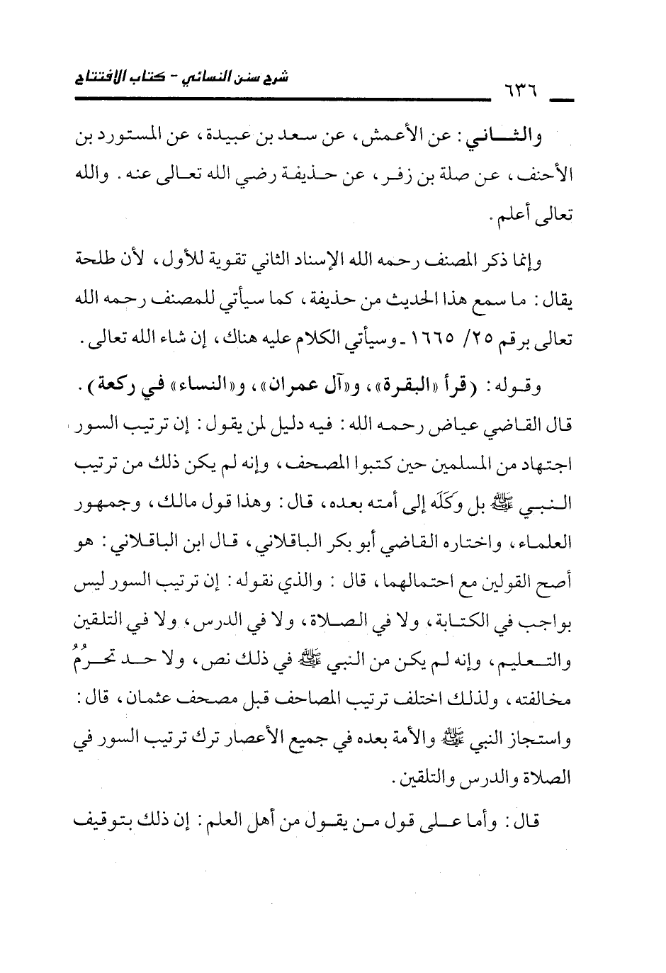 وقوله: (قرأ "البقرة"، و"آل عمران"، و"النساء" في ركعة). قال القاضي عياض رحمه الله: فيه دليل لمن يقول: إن ترتيب السور