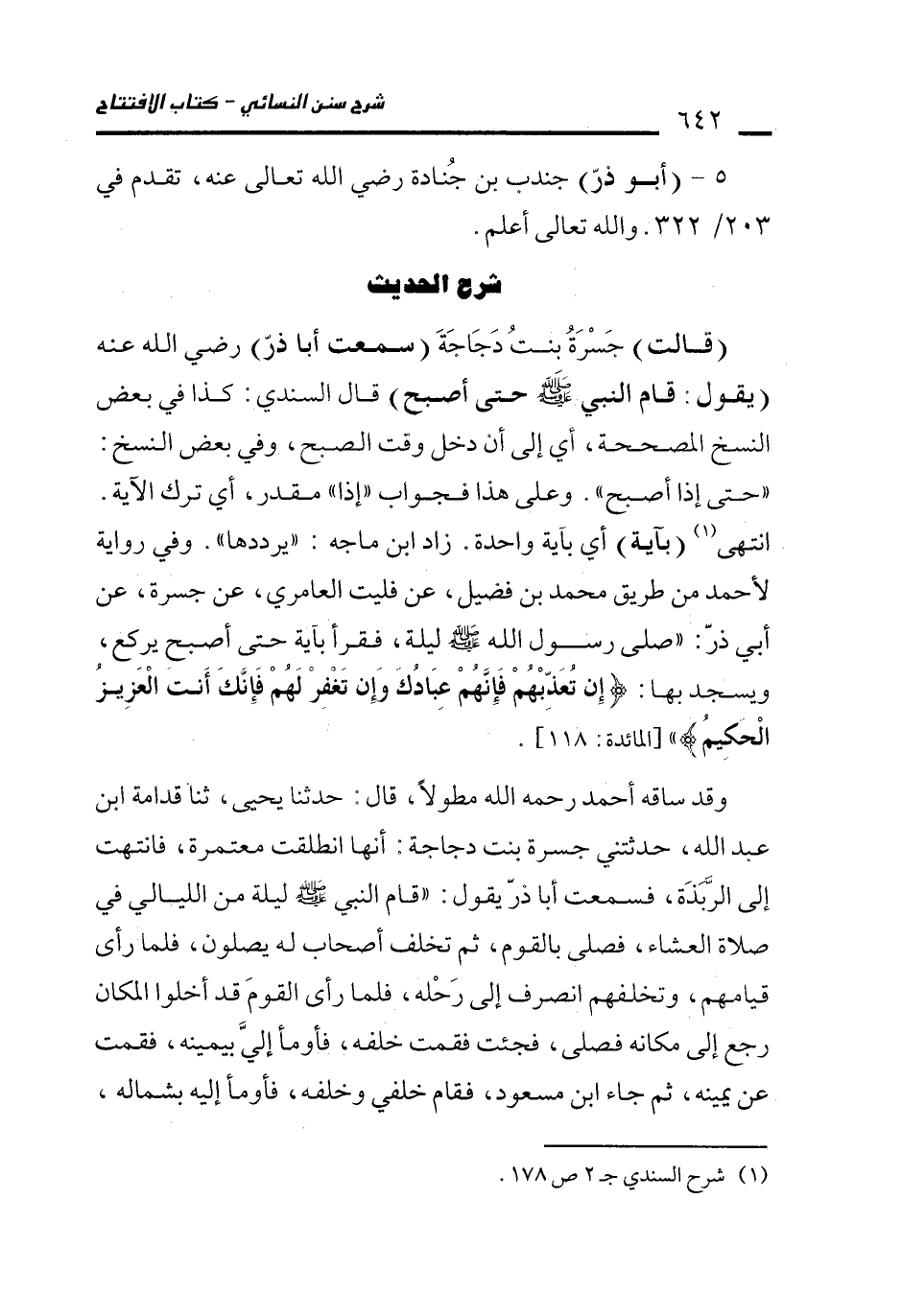(قالت) جَسْرَةُ بنتُ دَجَاجَةَ (سمعت أبا ذرّ) رضي الله عنه (يقول: قام النبي - صلى الله عليه وسلم - حتى أصبح) قال السندي: كذا في بعض النسخ المصححة، أي إلى أن دخل وقت الصبح، وفي بعض النسخ: "حتى إذا أصبح". وعلى هذا فجواب "إذا" مقدر، أي ترك الآية. انتهى (¬1) (لآية) آي بآية واحدة. زاد ابن ماجه: "يرددها". وفي رواية لأحمد من طريق محمد بن فضيل، عن فليت العامري، عن جسرة، عن أبي ذرّ: "صلى رسول الله - صلى الله عليه وسلم - ليلة، فقرأ بآية حتى أصبح يركع، ويسجد بها: {إِنْ تُعَذِّبْهُمْ فَإِنَّهُمْ عِبَادُكَ وَإِنْ تَغْفِرْ لَهُمْ فَإِنَّكَ أَنْتَ الْعَزِيزُ الْحَكِيمُ} " [المائدة: 118].