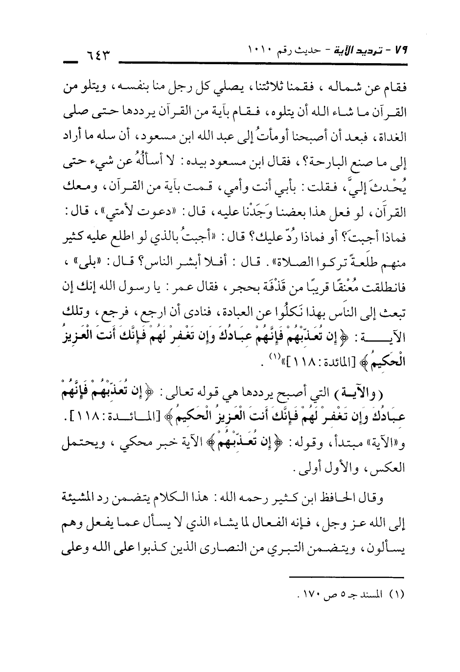 فقام عن شماله، فقمنا ثلاثتنا، يصلي كل رجل منا بنفسه، ويتلو من القرآن ما شاء الله أن يتلوه، فقام بآية من القرآن يرددها حتى صلى الغداة، فبعد أن أصبحنا أومأتُ إلى عبد الله ابن مسعود، أن سله ما أراد إلى ما صنع البارحة؟، فقال ابن مسعود بيده: لا أسألُهُ عن شيء حتى يُحْدثَ إليَّ، فقلت: بأبي أنت وأمي، قمت بآية من القرآن، ومعك القرآن، لو فعل هذا بعضنا وَجَدْنا عليه، قال: "دعوت لأمتي"، قال: فماذا أجبتَ؟ أو فماذا رُدّ عليك؟ قال: "أجبتُ بالذي لو اطلع عليه كثير منهم طلعةً تركوا الصلاة". قال: أفلا أبشر الناس؟ قال: "بلى"، فانطلقت مُعْنِقًا قريبًا من قَذْفَة بحجر، فقال عمر: يا رسول الله إنك إن تبعث إلى الناَس بهذا نَكلُوا عن العبادة، فنادى أن ارجع، فرجع، وتلك الآية: {إِنْ تُعَذِّبْهُمْ فَإِنَّهُمْ عِبَادُكَ وَإِنْ تَغْفِرْ لَهُمْ فَإِنَّكَ أَنْتَ الْعَزِيزُ الْحَكِيمُ} [المائدة: 118] " (¬1).