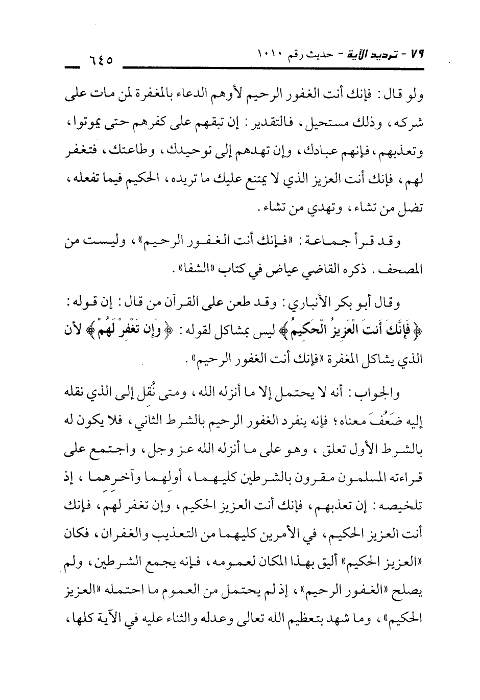 والجواب: أنه لا يحتمل إلا ما أنزله الله، ومتى نُقِل إلى الذي نقله إليه ضَعُفَ معناه؛ فإنه ينفرد الغفور الرحيم بالشرط الثاني، فلا يكون له بالشرط الأول تعلق، وهو على ما أنزله الله -عز وجل-، واجتمع على قراءته المسلمون مقرون بالشرطين كليهما، أولهما وآخرهما، إذ تلخيصه: إن تعذبهم، فإنك أنت العزيز الحكيم، وإن تغفر لهم، فإنك أنت العزيز الحكيم، في الأمرين كليهما من التعذيب والغفران، فكان "العزيز الحكيم" أليق بهذا المكان لعمومه، فإنه يجمع الشرطين، ولم يصلح "الغفور الرحيم"، إذ لم يحتمل من العموم ما احتمله "العزيز الحكيم"، وما شهد لتعظيم الله تعالى وعدله والثناء عليه في الآية كلها،