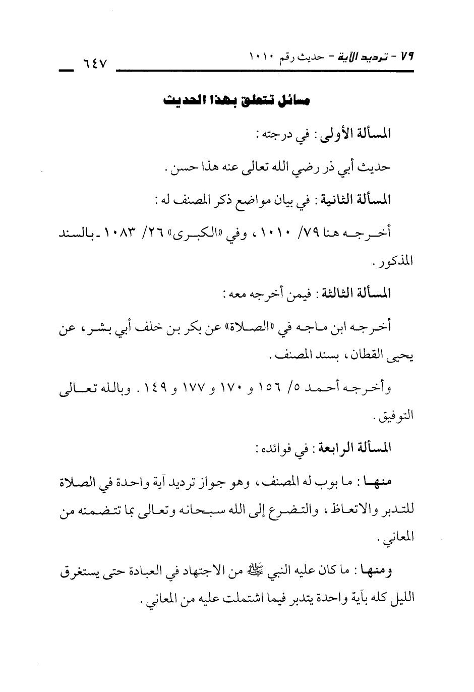 منها: ما بوب له المصنف، وهو جواز ترديد آية واحدة في الصلاة للتدبر والاتعاظ، والتضرع إلى الله سبحانه وتعالى بما تتضمنه من