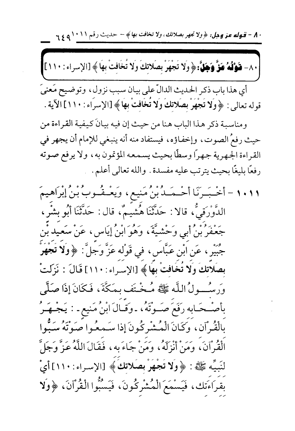 80 - قَوْلُهُ عَزَّ وَجَلَّ: {وَلَا تَجْهَرْ بِصَلَاتِكَ وَلَا تُخَافِتْ بِهَا} [الإسراء: 110]