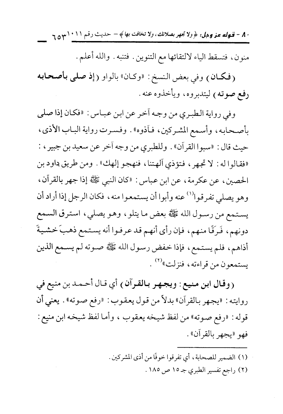 وفي رواية الطبري من وجه آخر عن ابن عباس: "فكان إذا صلى بأصحابه، وأسمع المشركين، فآذوه". وفسرت رواية الباب الأذى، حيث قال: "سبوا القرآن". وللطبري من وجه آخر عن سعيد بن جبير: "فقالوا له: لا تجهر، فتؤذي آلهتنا، فنهجو إلهك". ومن طريق داود بن الحصين، عن عكرمة، عن ابن عباس: "كان النبي - صلى الله عليه وسلم - إذا جهر بالقرآن، وهو يصلي تفرقوا (¬1) عنه وأبوا أن يستمعوا منه، فكان الرجل إذا أراد أن يستمع من رسول الله - صلى الله عليه وسلم - بعض ما يتلو، وهو يصلي، استرق السمع دونهم، فَرَقًا منهم، فإن رأى أنهم قد عرفوا أنه يستمع ذهبَ خشيةَ أذاهم، فلم يستمع، فإذا خفض رسول الله - صلى الله عليه وسلم - صوته لم يسمع الذين يستمعون من قراءته، فنزلت" (¬2).